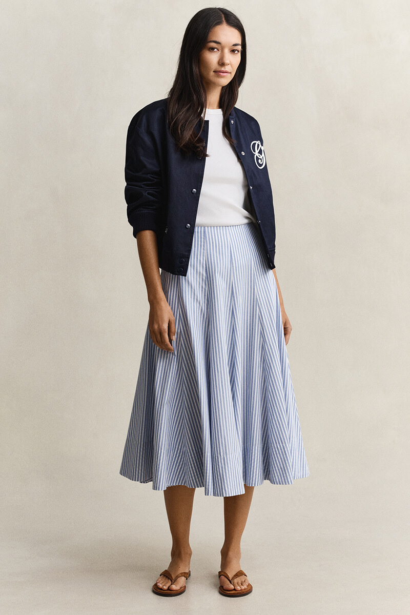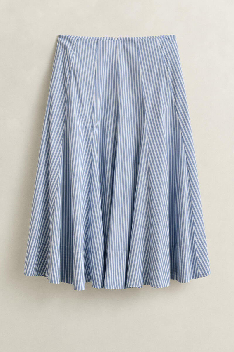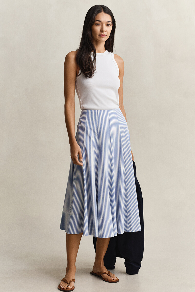 Den här randiga kjolen från Gant är tillverkad i 100% bomull med fil-à-fil-konstruktion – ett tyg där varp och inslagstrådarna i olika färger skapar en unik och livfull struktur.Med en regular fit, medelhög midja, midilängd och A-linjeform skapar den en tidlös stil. Den har påsydda paneler både fram och bak, vilket ger kjolen en vacker veckad look och gör att den kan röra sig fritt.