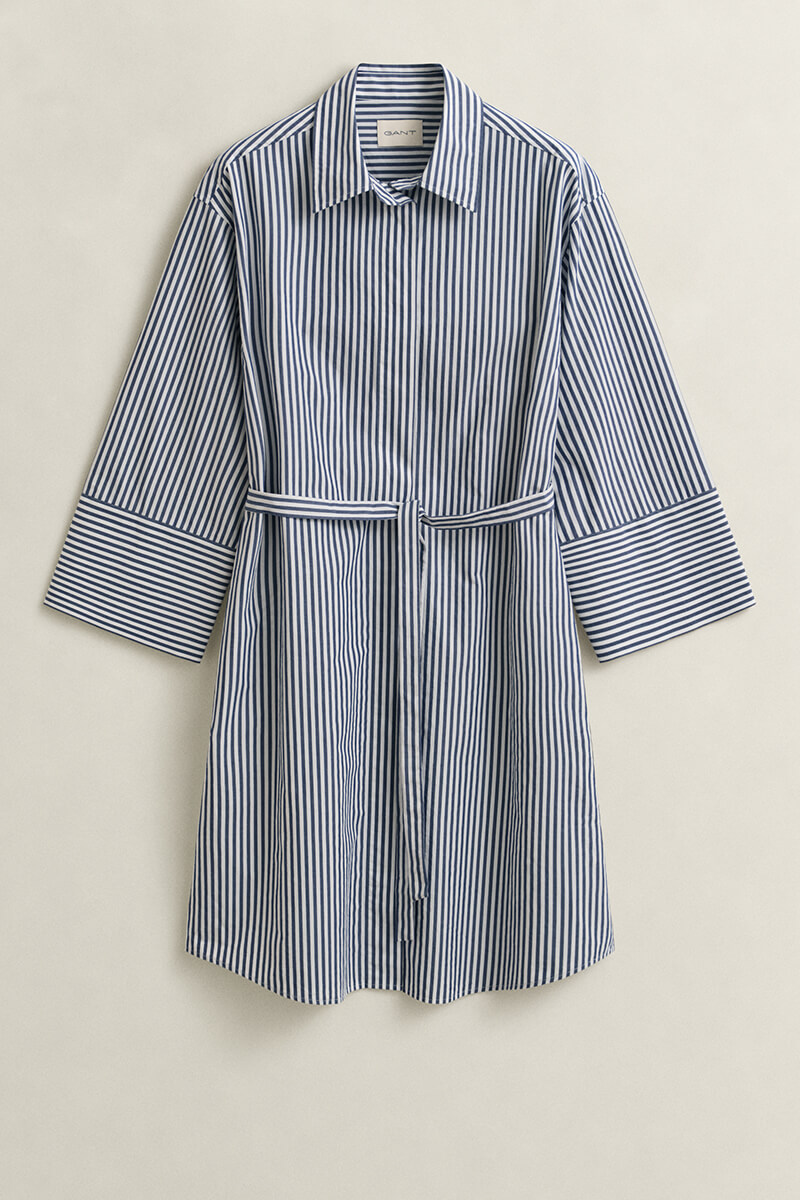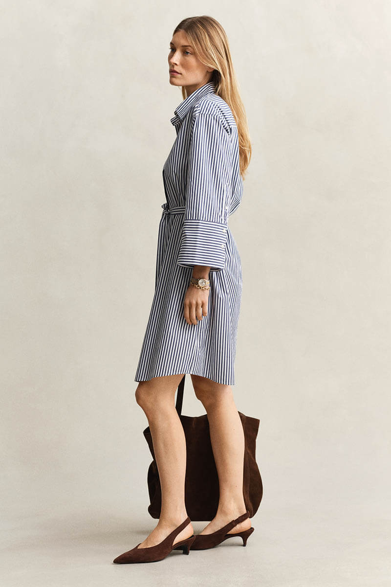 En tidlös skjortklänning i krispig bomullspoplin som förenar klassisk stil med modern komfort. Den randiga designen och den avslappnade silhuetten gör den till ett perfekt val för en stilsäker vardagslook, oavsett om den bärs med eller utan midjebälte.