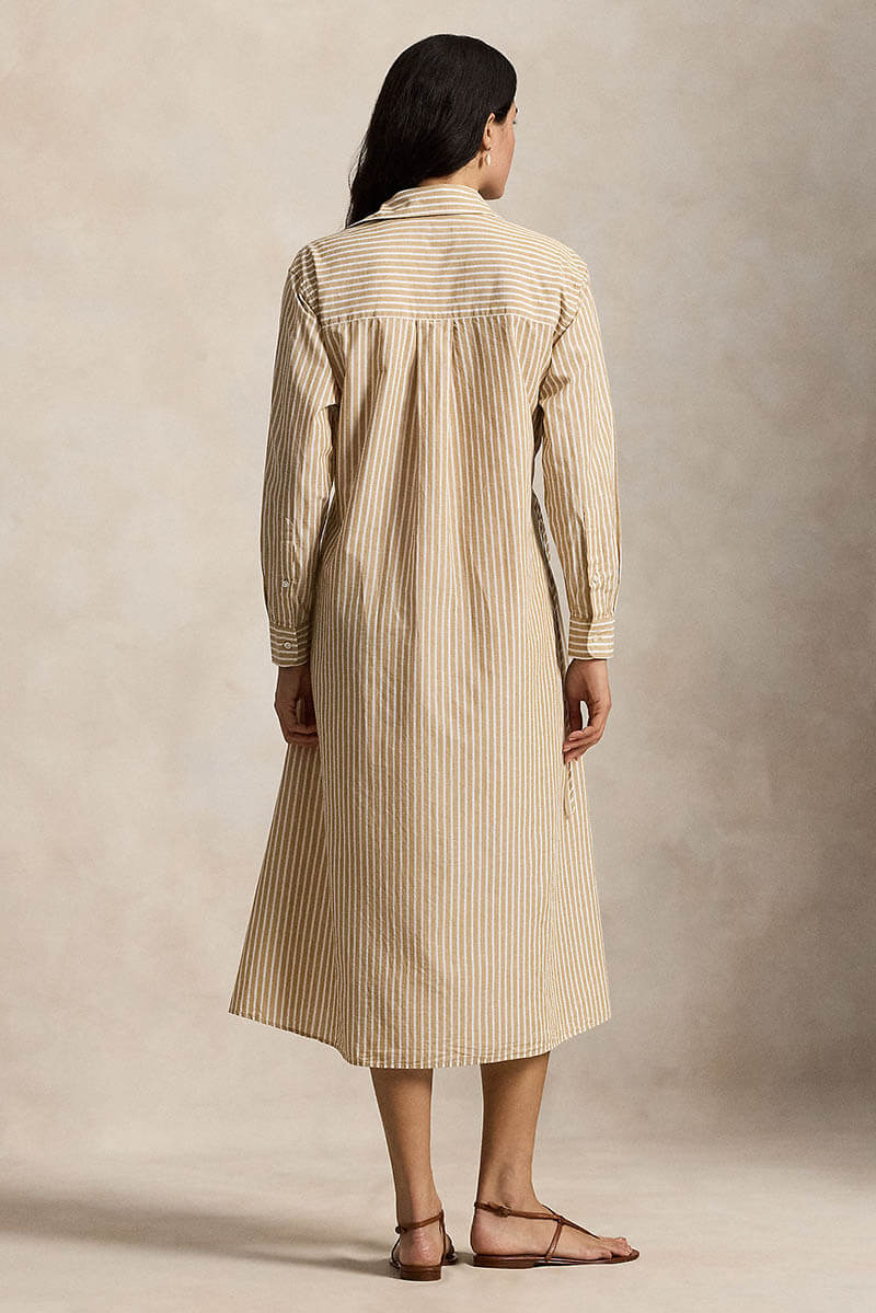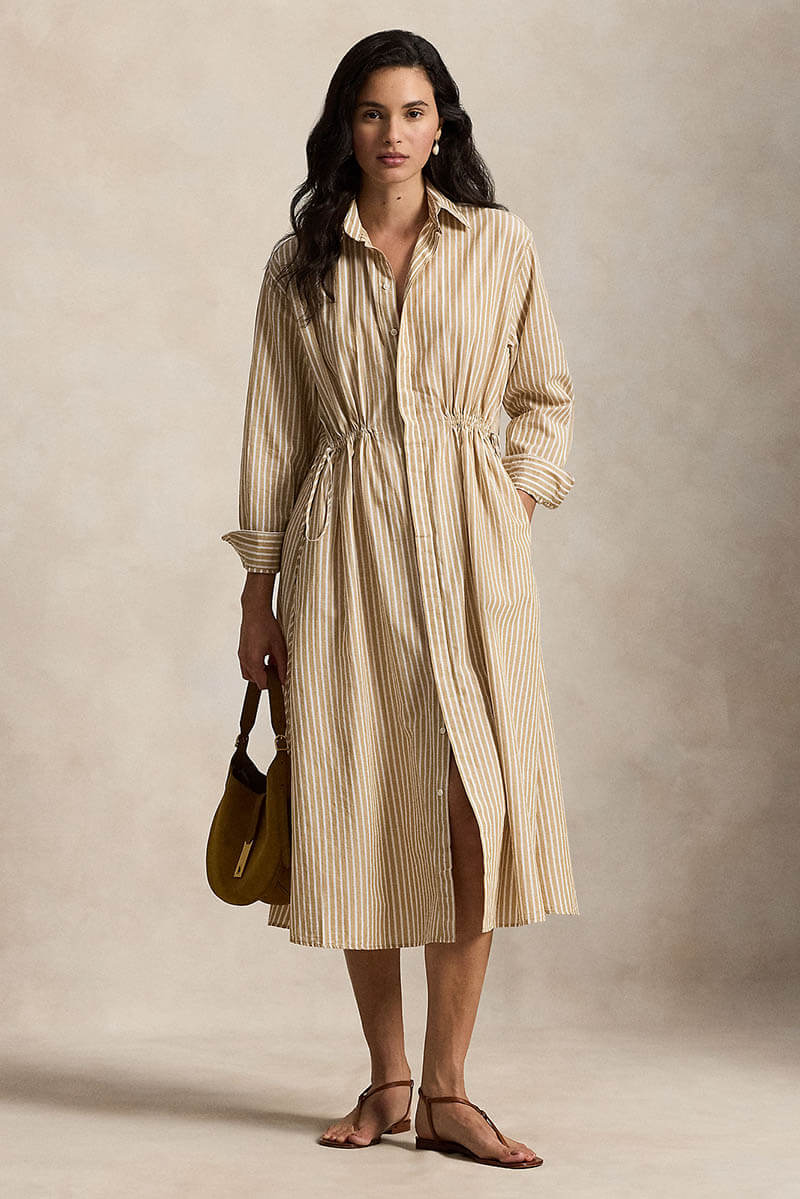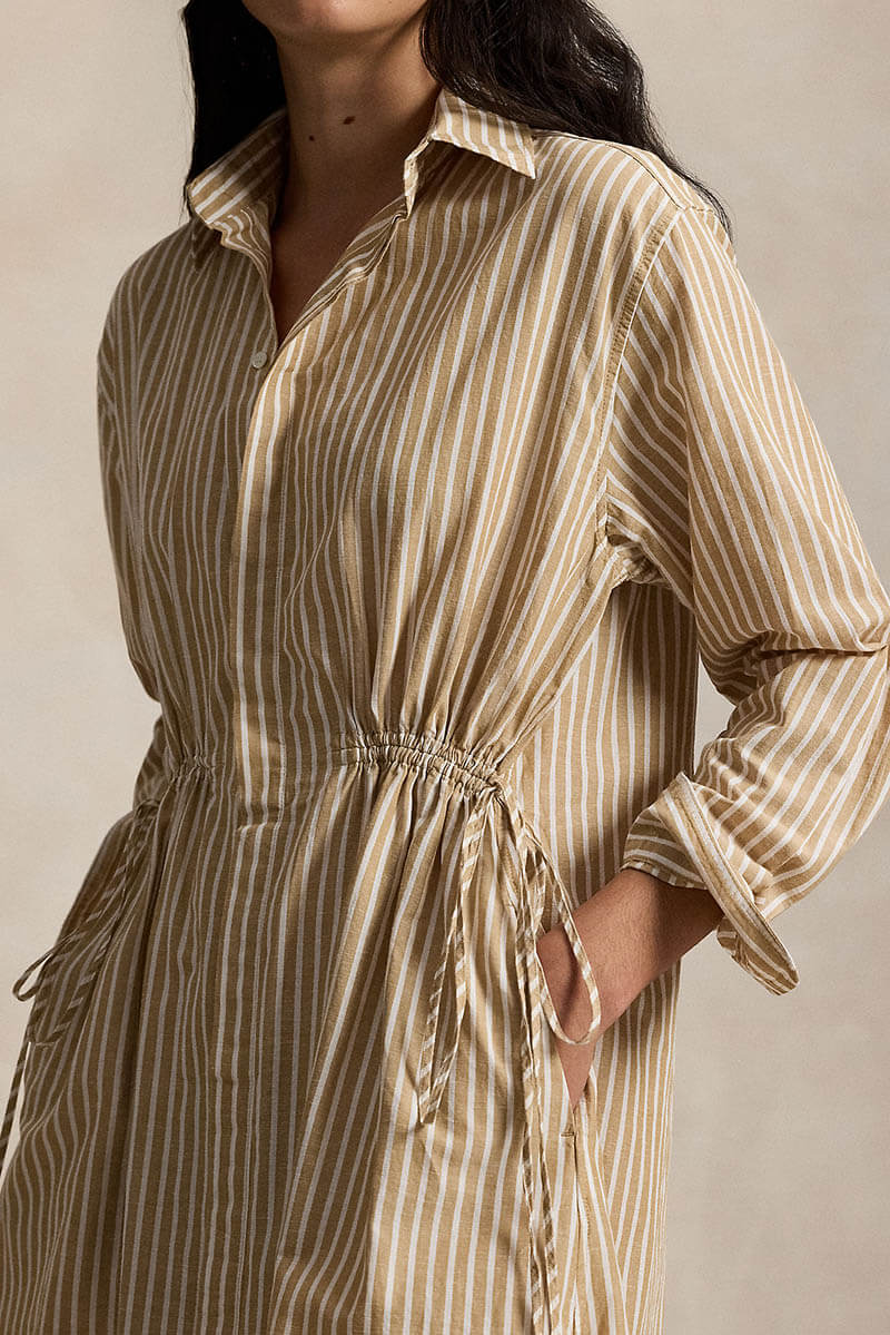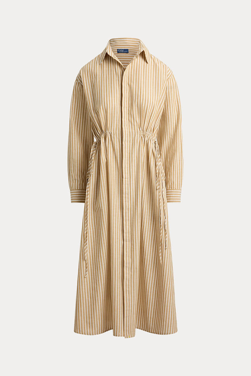 Striped cotton-linen drawcord shirtdress, Classic camel