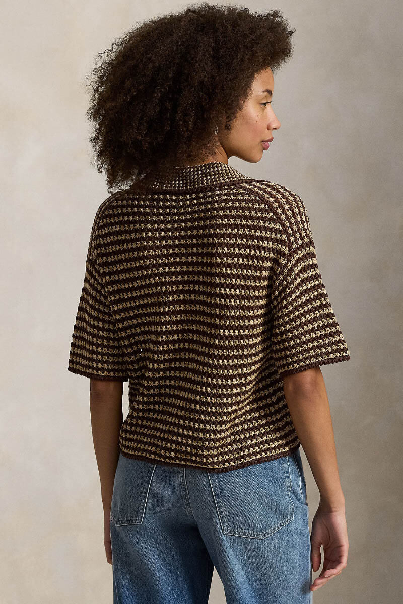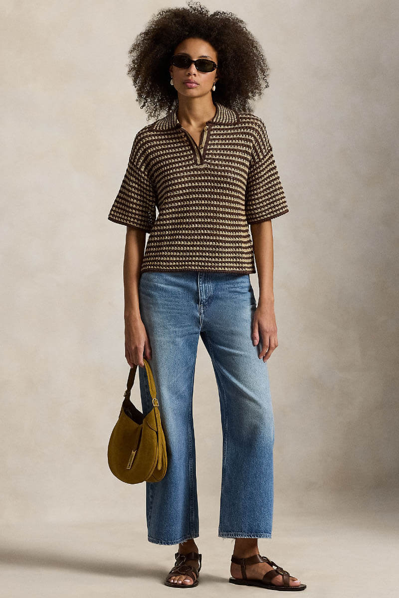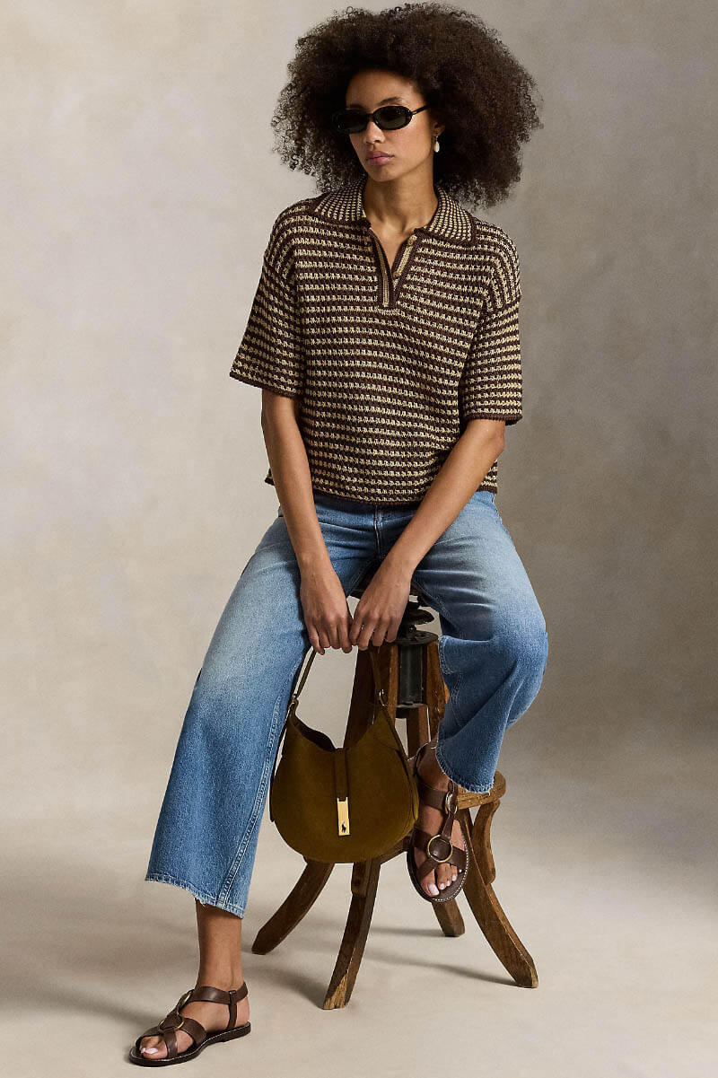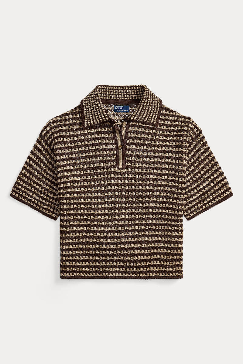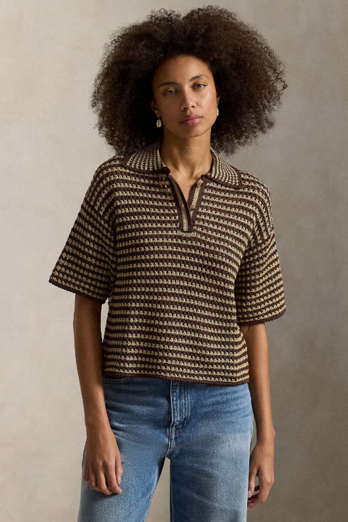En modern och feminin topp inspirerad av den klassiska polotröjan. Den öppet stickade strukturen och de virkade detaljerna skapar ett elegant uttryck, medan den avslappnade, något croppade passformen ger en lätt och stilren siluett. Stylea den med en tunn polotröja och jeans för en modern vardagslook.