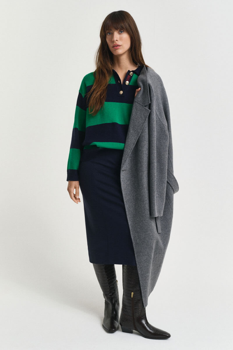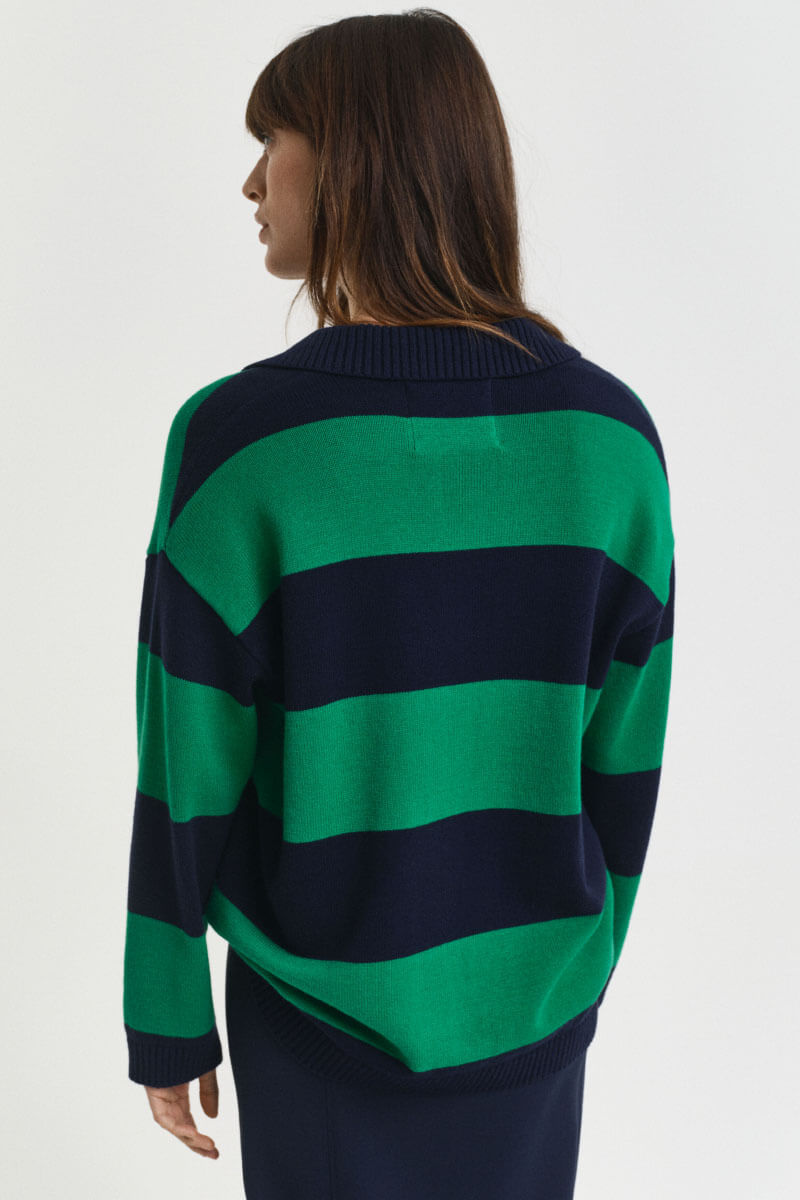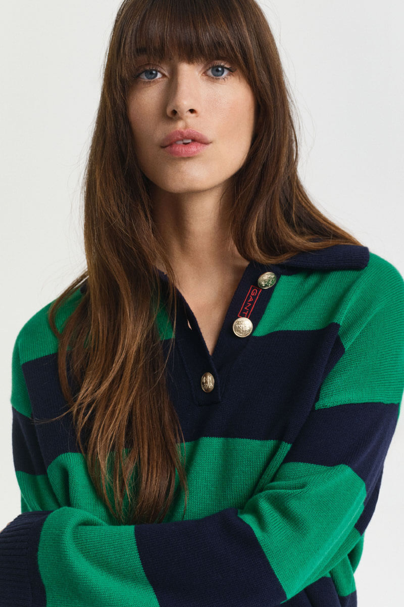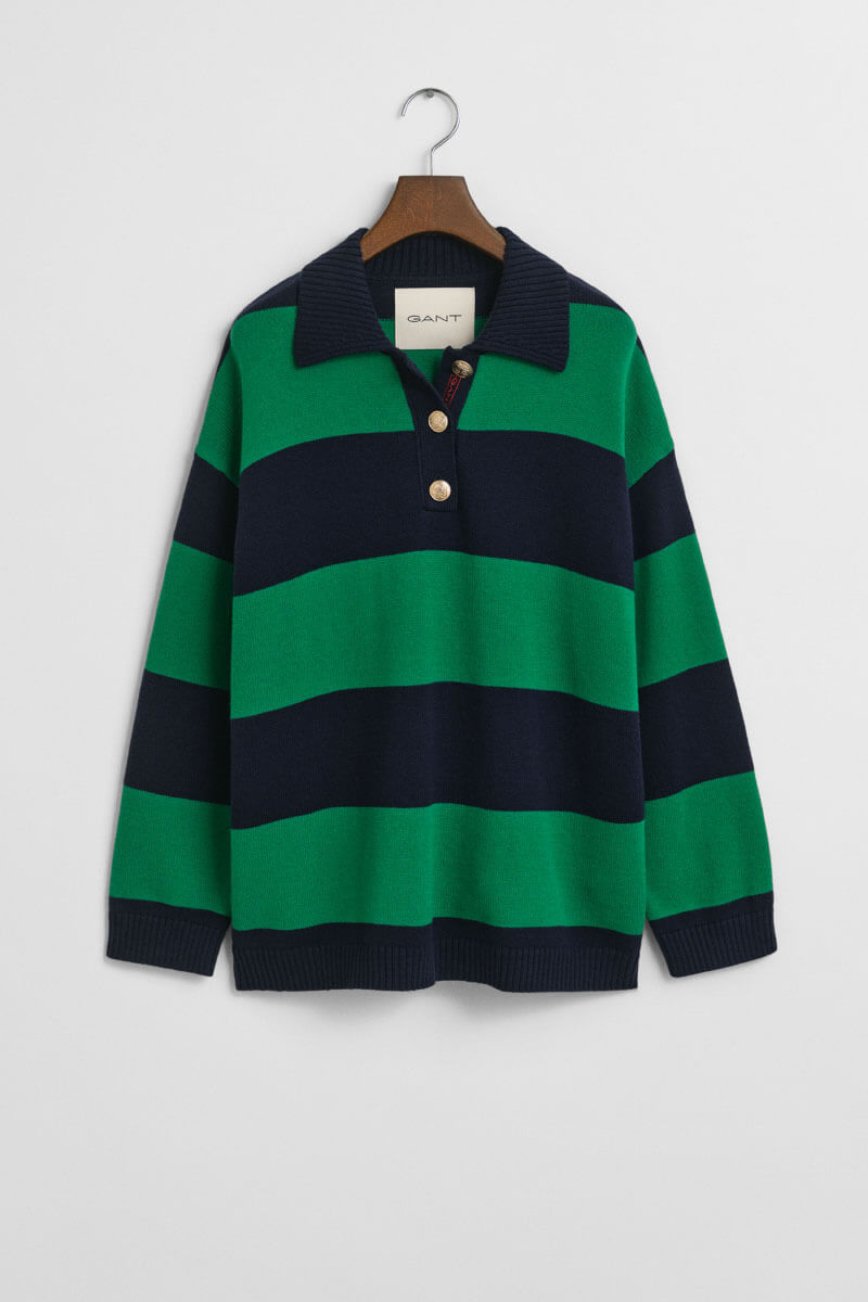 Randig tröja i grönt och marinblått med guldknappar och krage – sportig elegans i stickad form. Bär den till mörk denim och loafers för vardag, eller över en vit skjorta med kostymbyxa för en uppdaterad, preppy höststil.Randig stickad tröja i en bomullsblandning med oversize passform, fallande axelsömmar, ribbstickad krage och kanter från Gant.