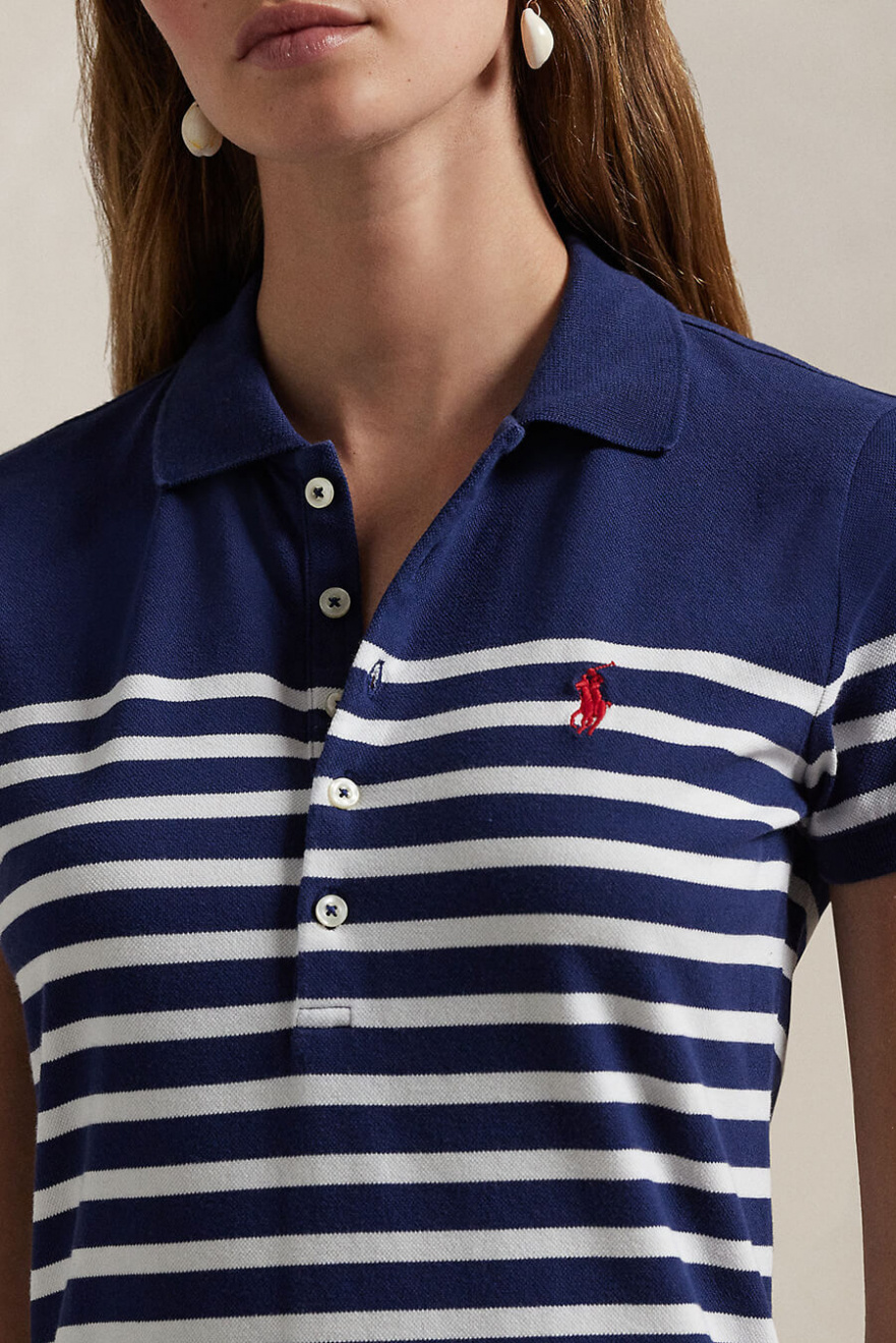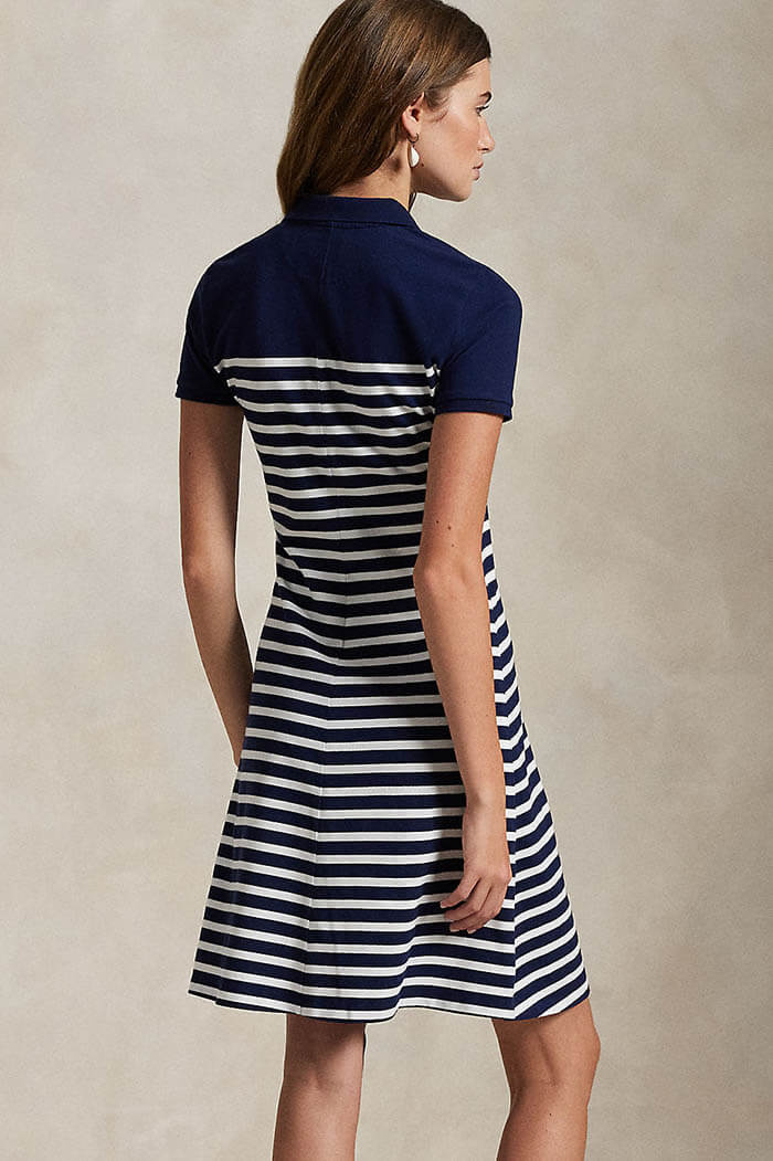 Segla genom vardagen i denna randiga klänning – ett perfekt möte mellan casual chic och marint klassiskt. Med mjuk passform och tidlös design är den idealisk för allt från strandpromenader till stadshäng. Styla med ballerinas för en elegant look!Pikéklänning i en bomullsblandning med knappar fram, liten broderad logga, korta ärmar, knälång och A-formad från Polo Ralph Lauren.