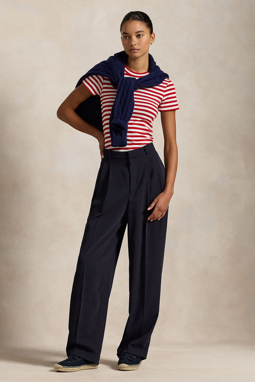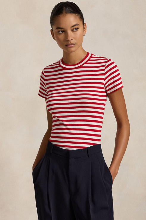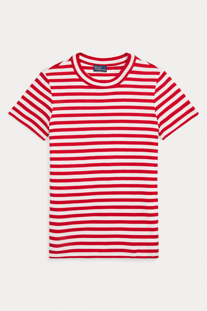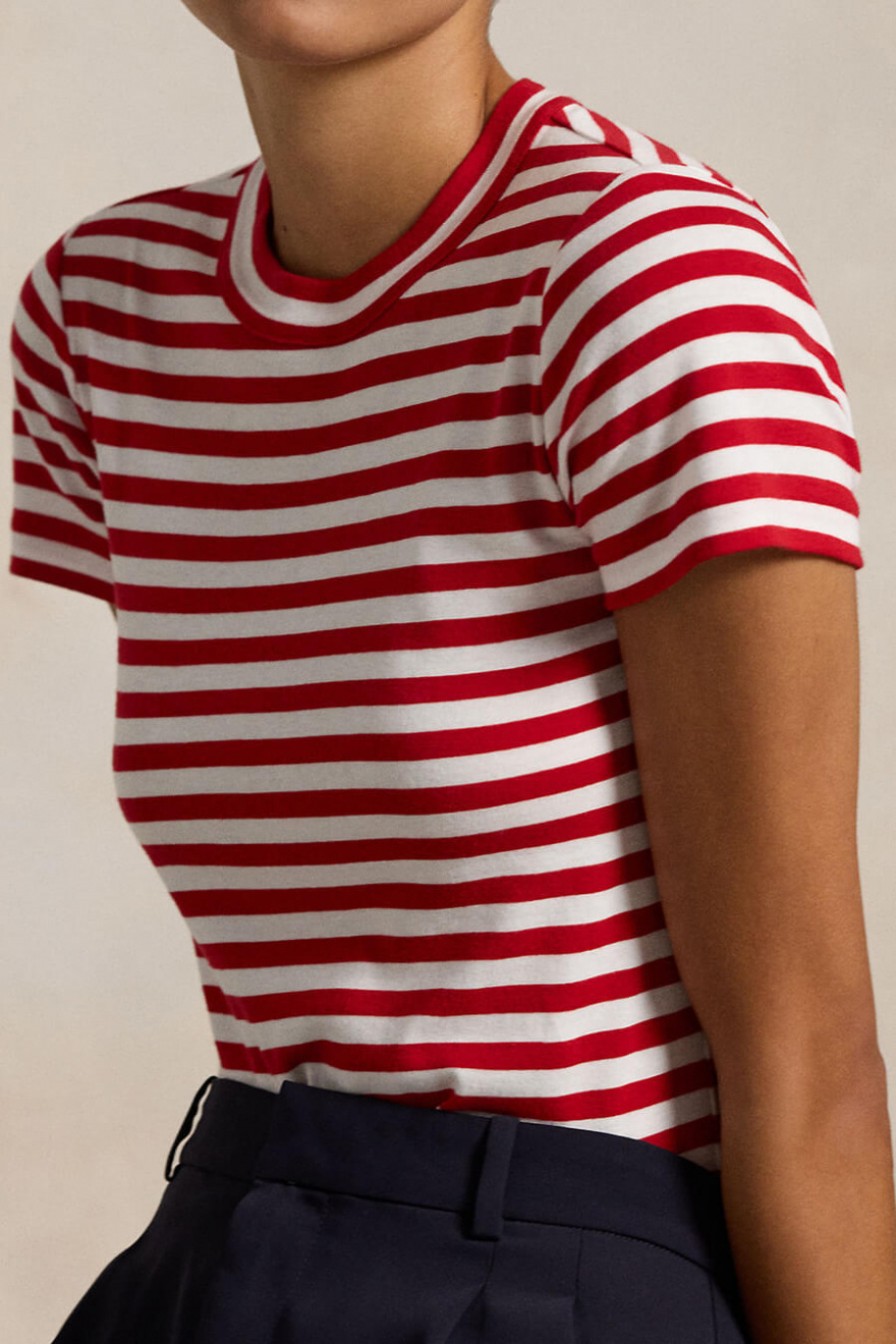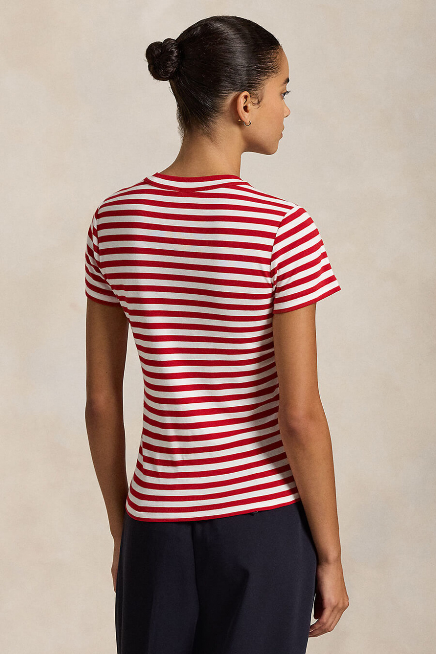 Den röd- och vitrandiga t-shirten är den perfekta mixen av tidlös och trendig. Med sin smala passform och höga halsringning skapar den en skarp silhuett. Bär den till jeans, kjol eller under en blazer – en klassiker du alltid behöver.Randig t-shirt i mjuk bomull med hög halsringning, korta ärmar och smal passform från Polo Ralph Lauren.