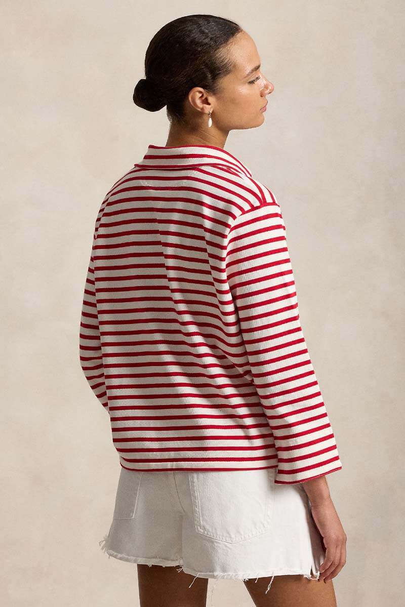 Denna randiga marinertröja är tillverkad i mjuk något tjockare bomullsjersey och kombinerar ett garnfärgat randigt mönster med en klassisk nautisk design. Den har en stilren krage och en öppen slitsad knappslå som ger ett avslappnat men sofistikerat uttryck.