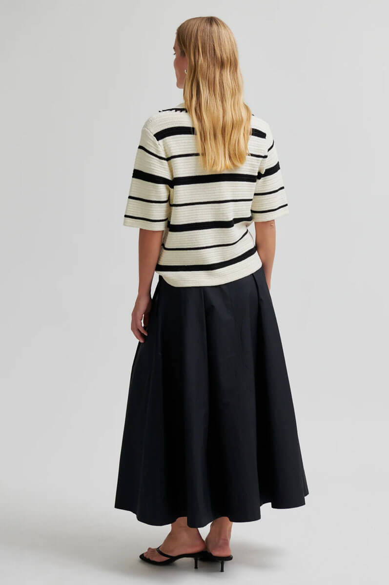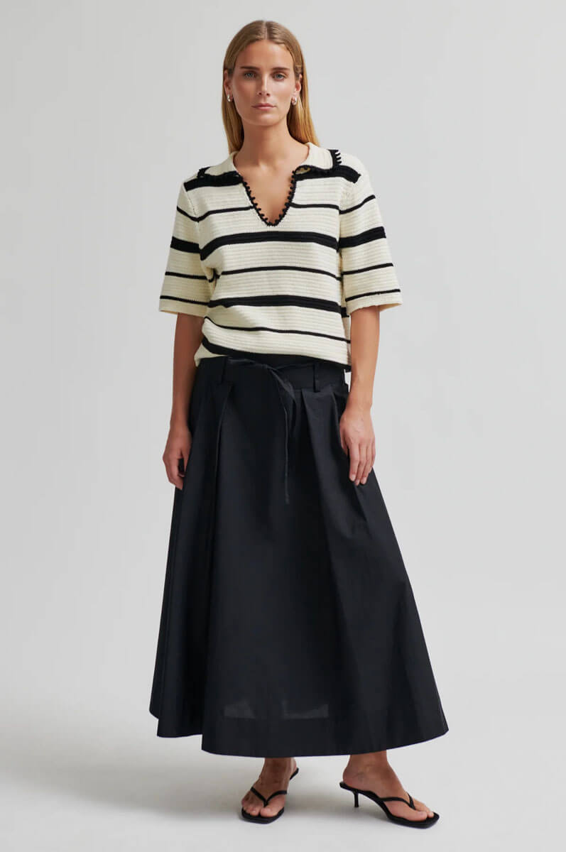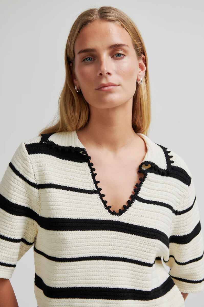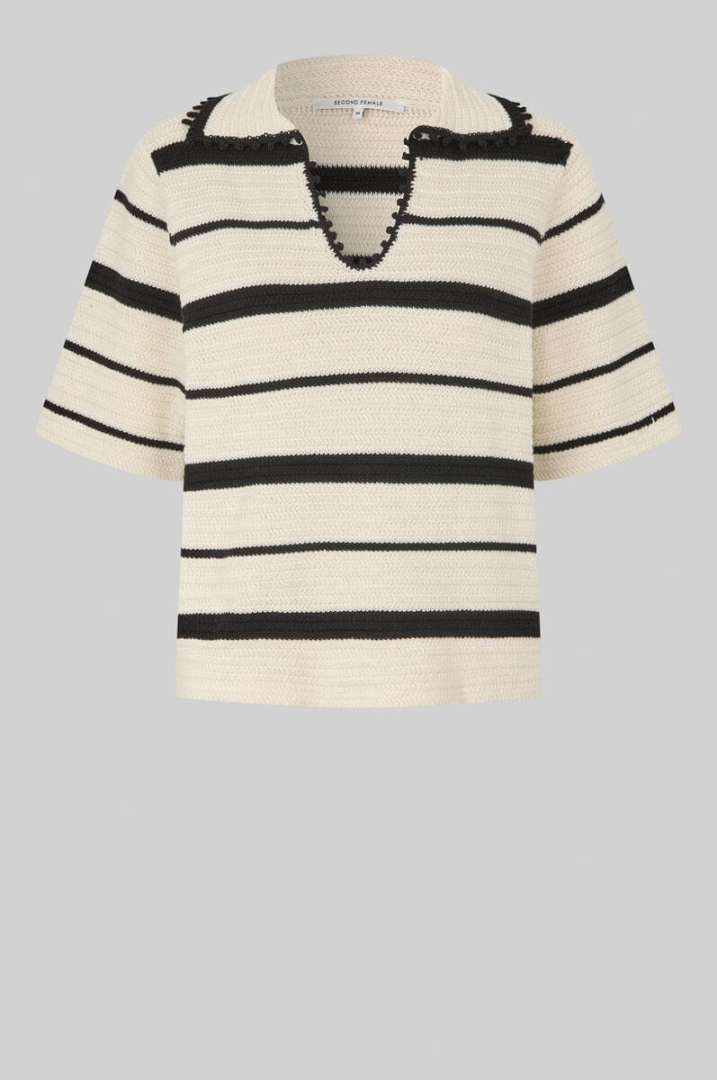 Second Female randig stickad tröja med en snygg kort ärm i svart/cream.Tröjan är tillverkad i tjock, högkvalitativ bomull med kontraststickade ränder som ger ett stilrent och modernt uttryck. Designad med öppen krage med dekorativ bobbeldetalj samt korta ärmar för en avslappnad men trendig look.