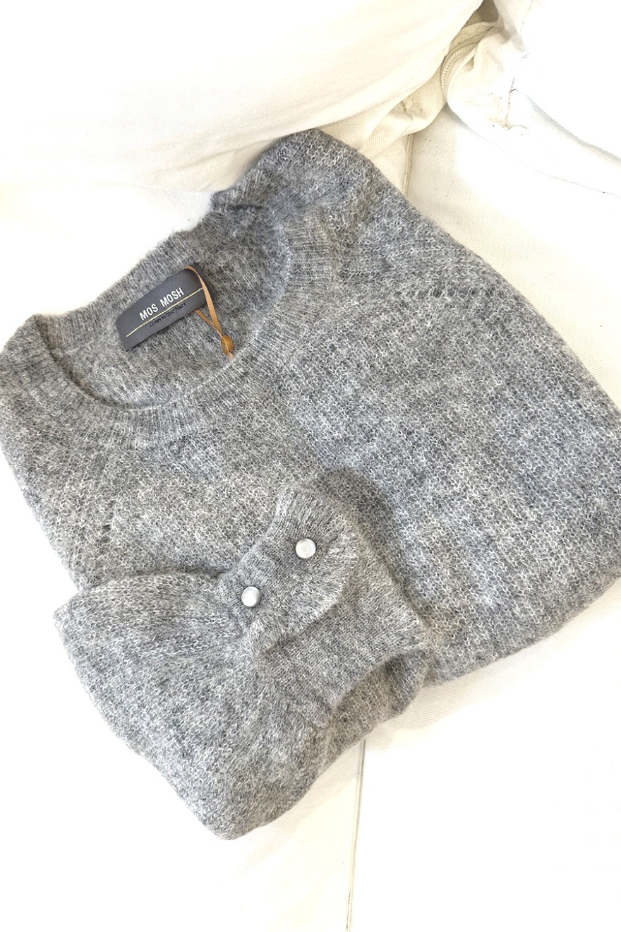 En fin stickad tröja med detaljer men ändå enkel.Knappen på ärmavslutet gör det lilla extra till den här tröjan.Stickad tröja i en ullblandning med rund halsringning, lös passform, ribbstickade kanter, ballongärmar med knappar vid ärmslut från MosMosh.