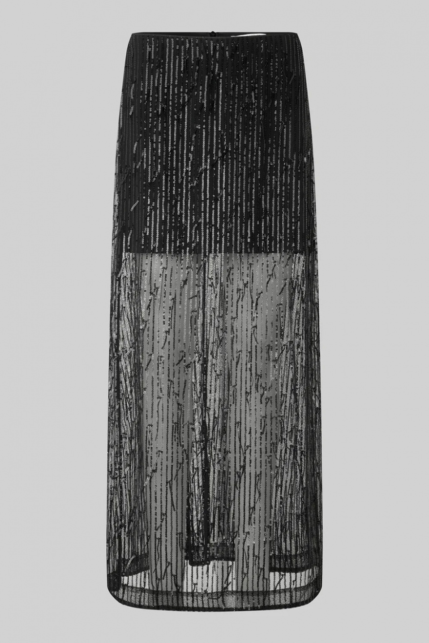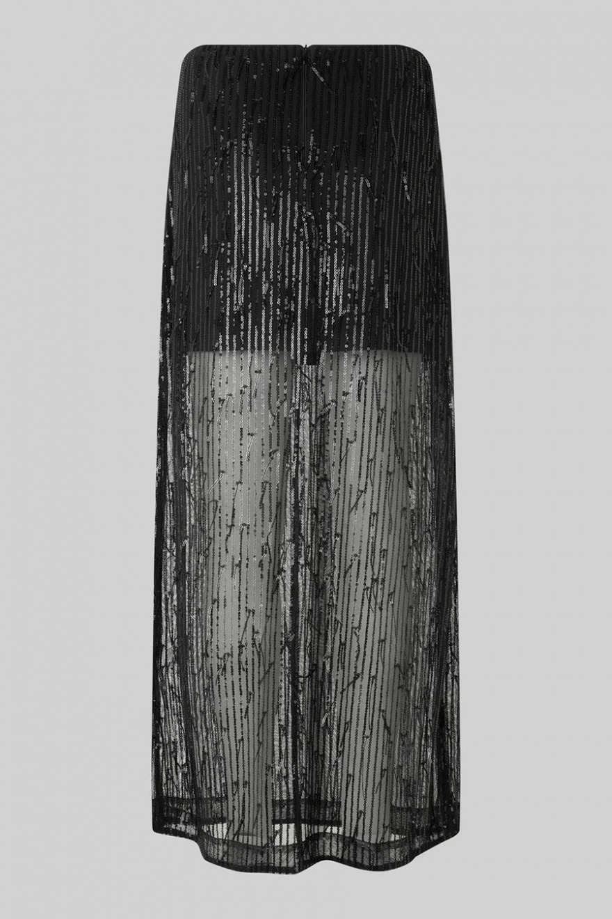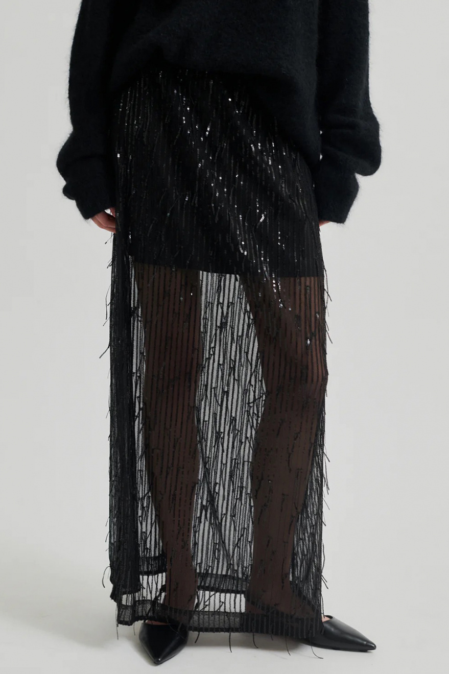 Lyft din stil med denna fantastiska svarta kjol, dekorerad med svarta paljetter som glittrar i ljuset! Den korta underkjolen och det transparenta tyget skapar en lekfull look, perfekt för fest eller en utekväll.Lång kjol med paljetter, hög midja, gömd dragkedja, elastisk midjeband, kort underkjol, något trasparent och rak passform från Second Female.