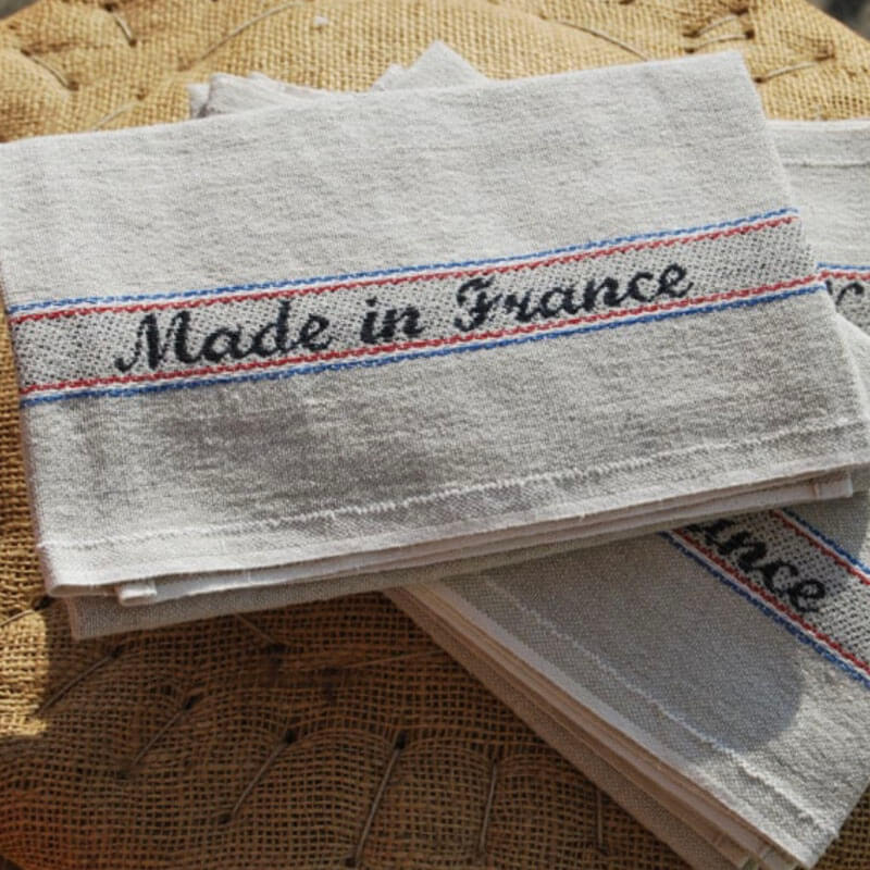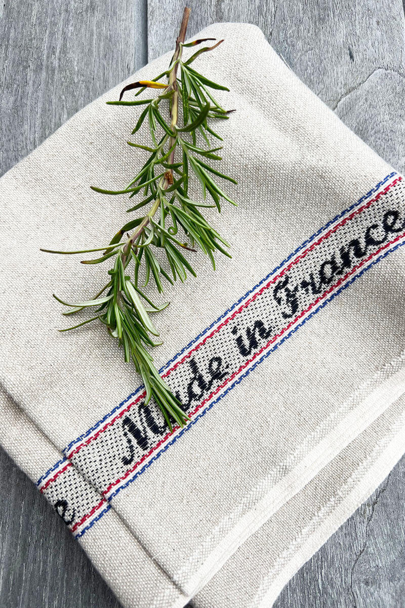 En kökshandduk i mjuk linne- och bomullsblandning, vävd i Frankrike med omsorg för både form och funktion. Den subtila texten made in France ger en elegant blinkning till dess ursprung – en detalj som gör skillnad.Perfekt att låta hänga synligt i köket eller använda vid en enkel lunchdukning. En vardagsnära lyx med känsla av franskt hantverk och stil.