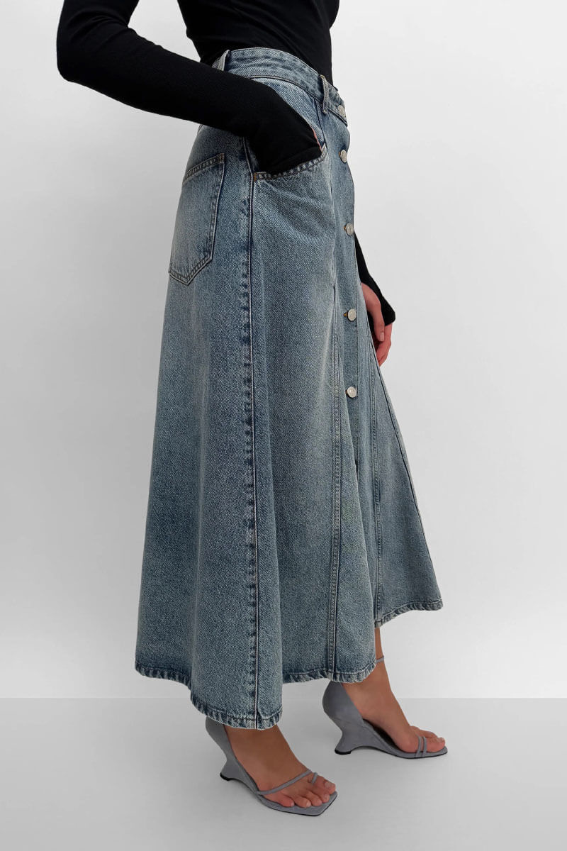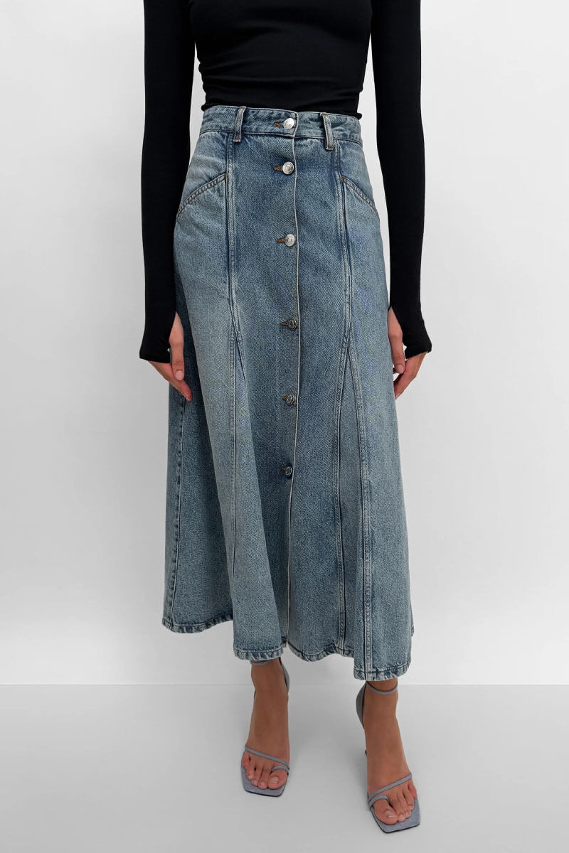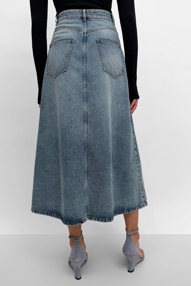Midilång denimkjol med medelhög midja, klassiska fem fickor och dekorativa v-insatser. Kjolen har en tidlös design och stängs med knappar längs hela framsidan.