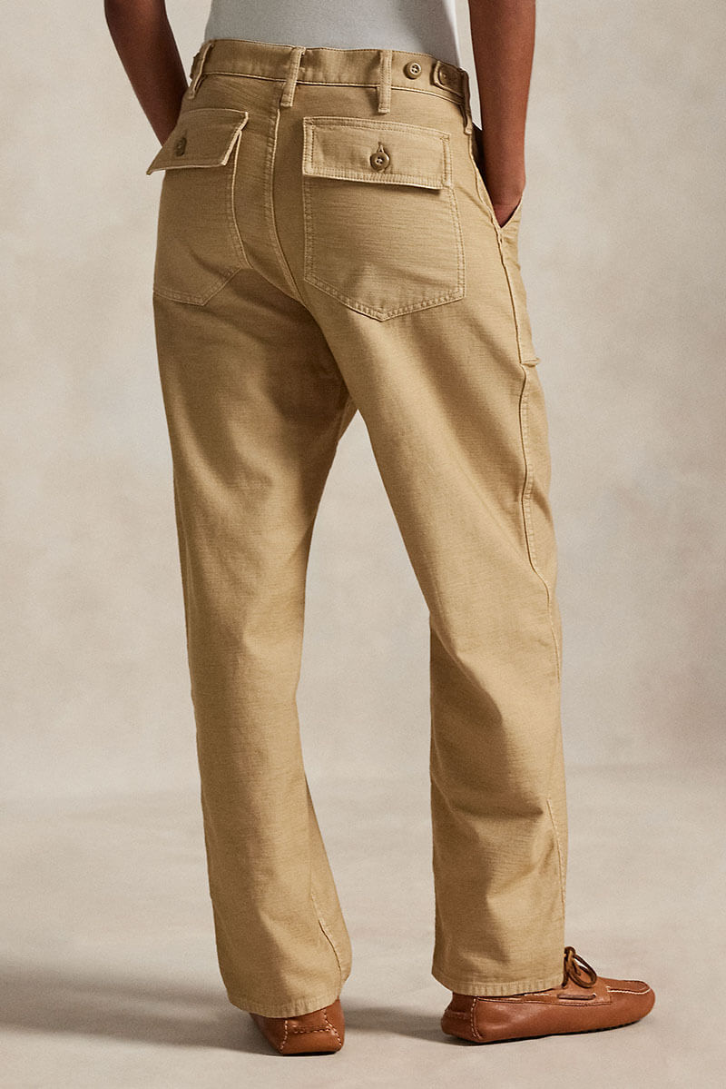 Modellen har justerbara knäppbara flikar i midjan för en personlig passform, samt utility-inspirerade fickor som tillför en modern och funktionell detalj. Varje plagg är specialfärgat för att skapa unika nyansskiftningar, vilket ger byxan ett lätt vintageinspirerat, levt uttryck.