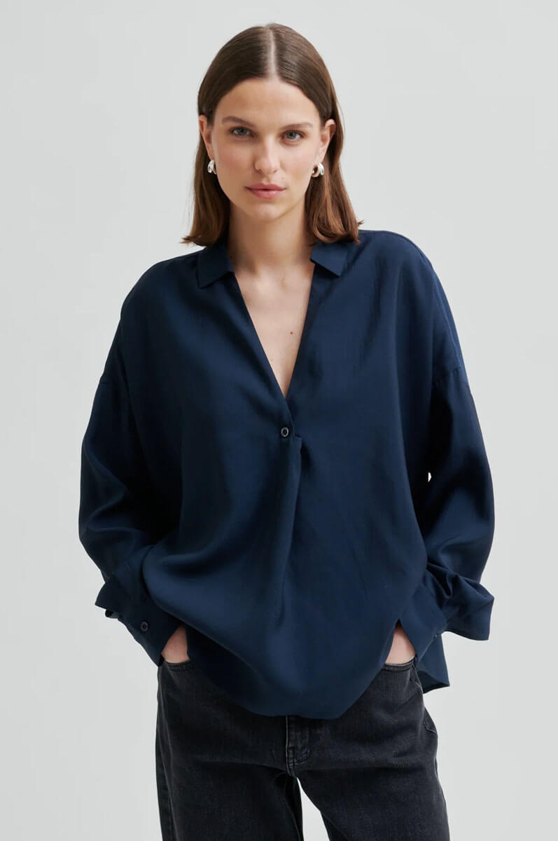 Skandinavisk enkelhet och elegans kännetecknar den här snygga blusen!En snygg blus i loose fit som har en knappdetalj fram. Lika snygg instoppad somlöst hängande.