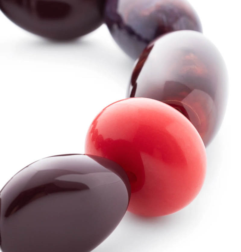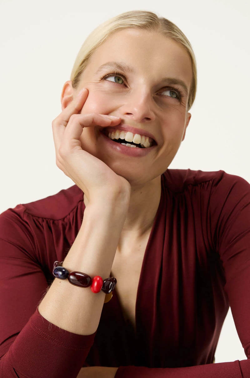 De organiskt formade acetatpärlorna är trädda på ett flexibelt band som följer handleden och ger en behaglig, följsam passform.