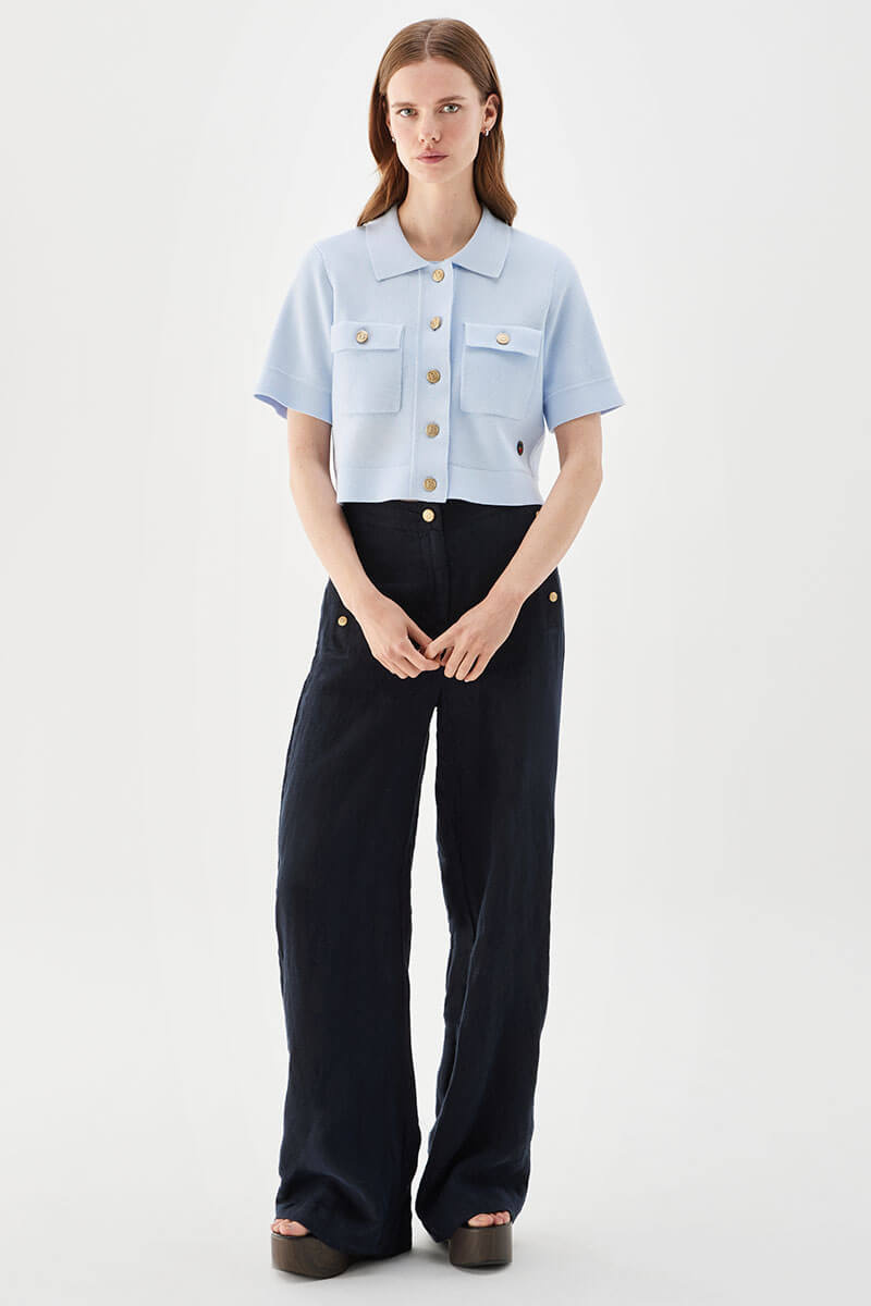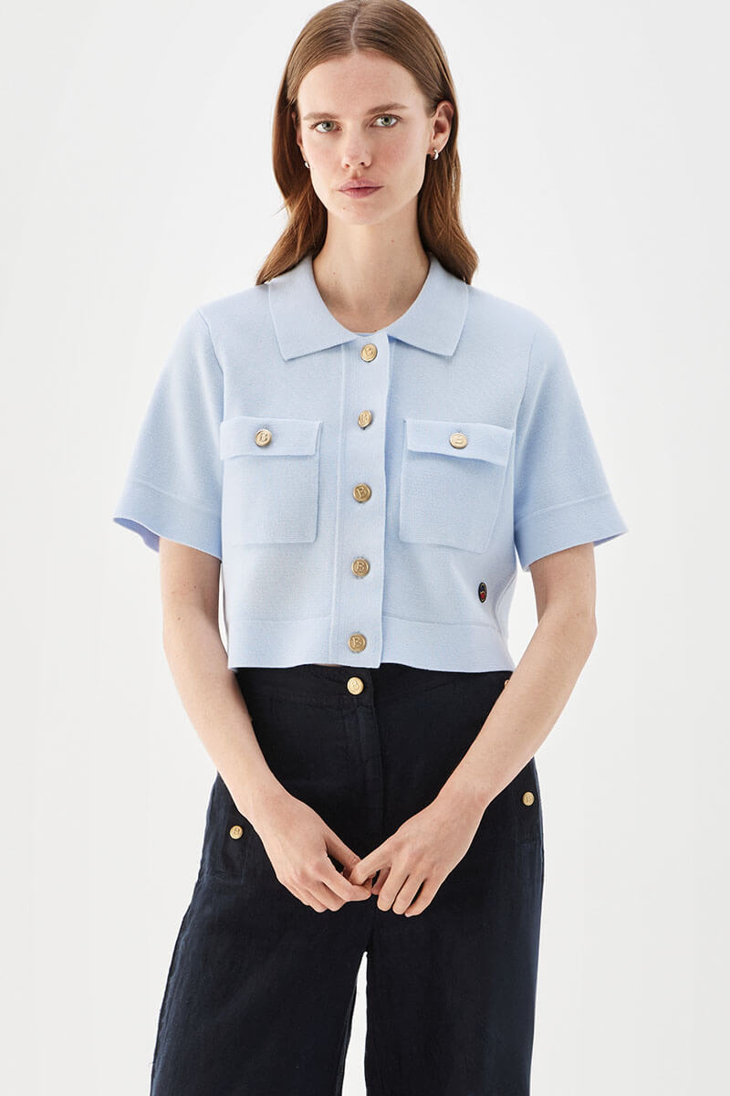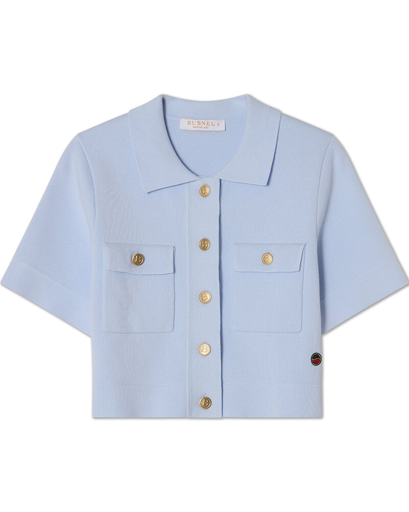 Den korta jackan har en klassisk krage, påsydda fickor och är elegant avslutad med dekorativa guldfärgade knappar. Jackan kan bäras som en topp tillsammans med högmidjade byxor, shorts eller kjol, eller stylas som en kort bolerojacka över en klänning. En mångsidig bomullsjacka som passar både till vardag och mer uppklädda tillfällen.