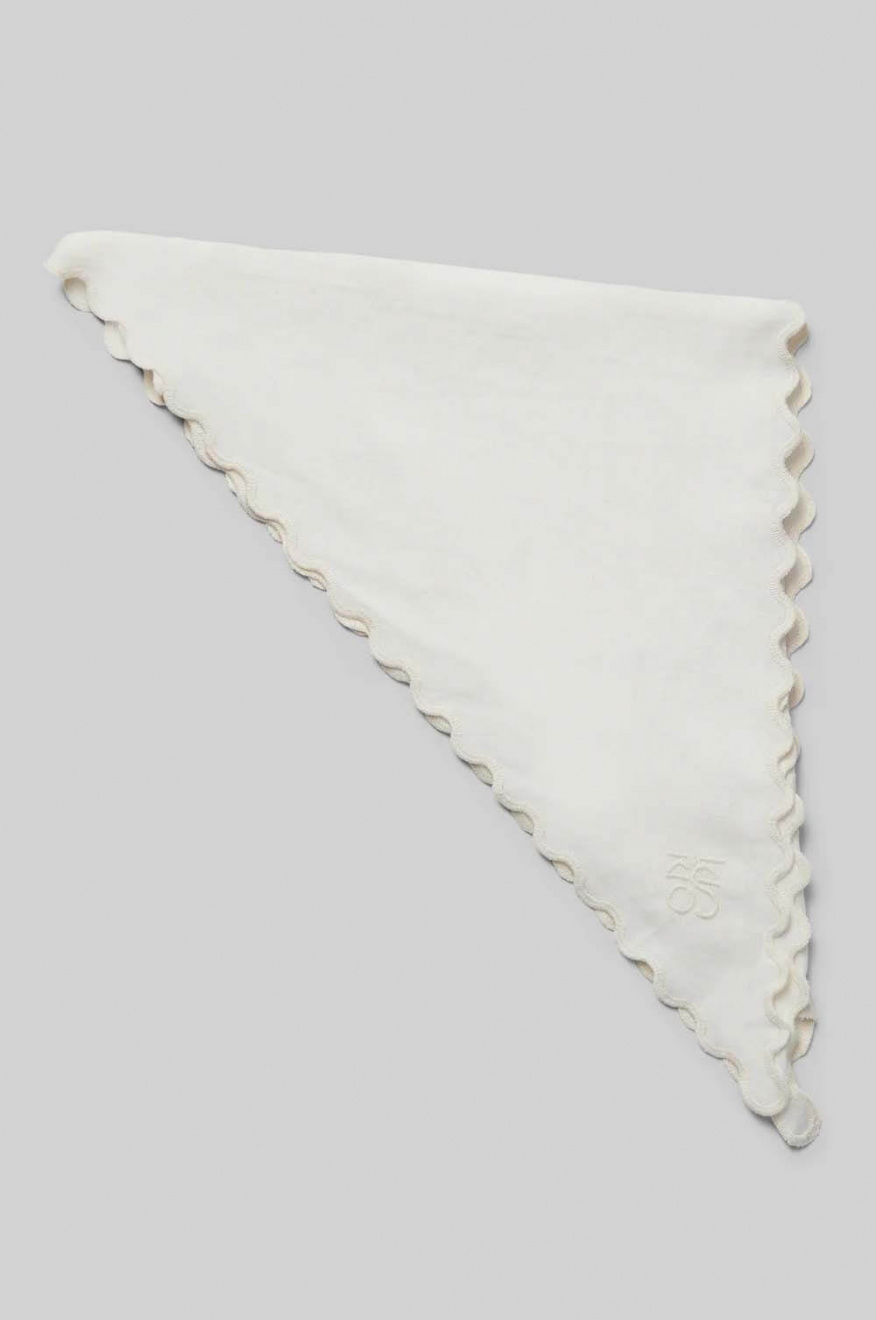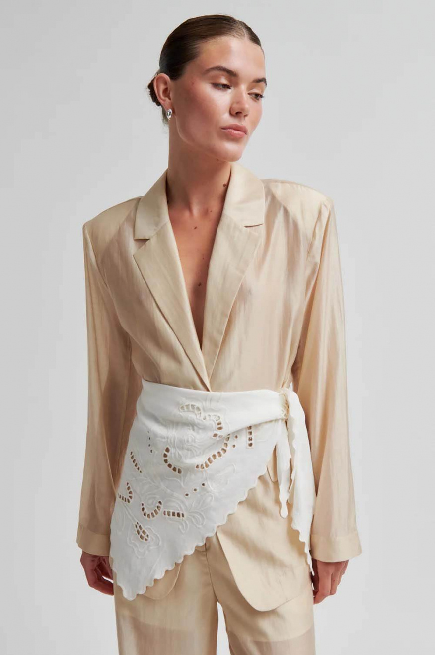 Second Female scarf – tillverkad i en viskos-linneblandning med broderade cutwork-detaljer och vågig kant längs kanterna. Fyrkantig modell med broderad logotyp i ena hörnet.