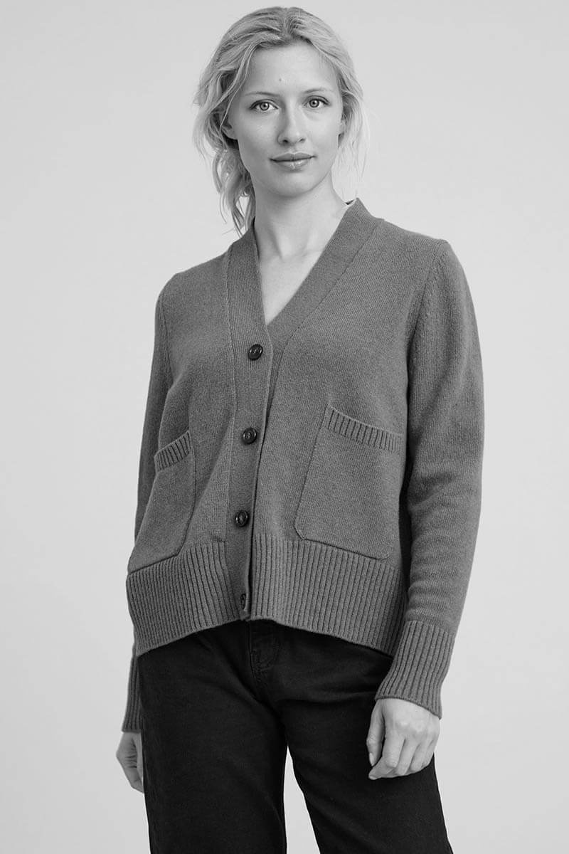 Kofta i en ullblandning med lös passform, ribbstickade kanter, v-ringning, stängs med knappar fram och fickor från Sibin Linnebjerg.