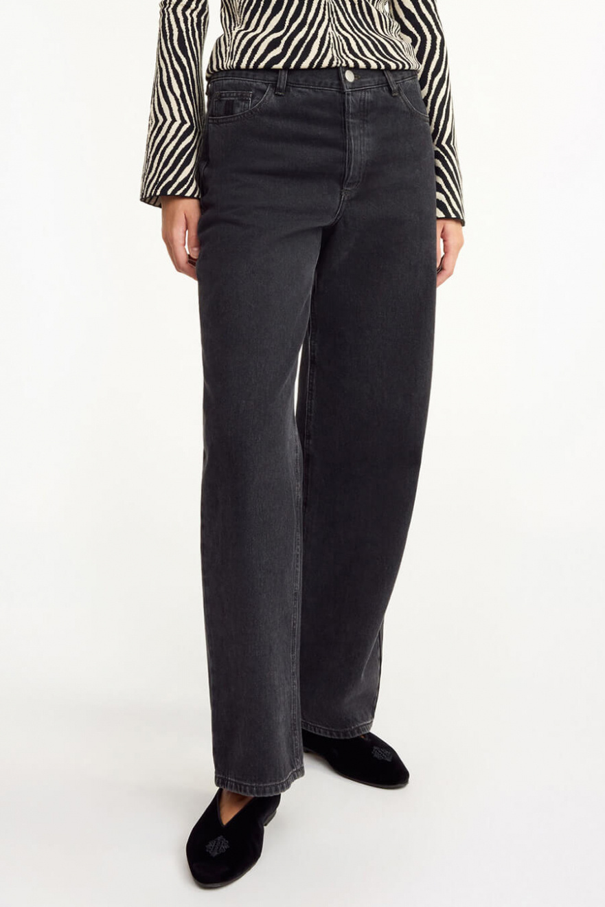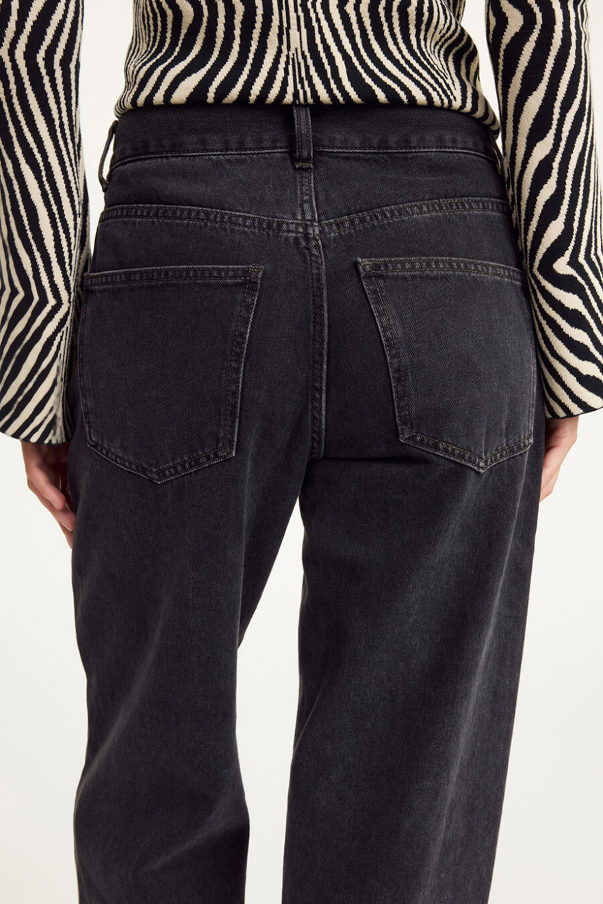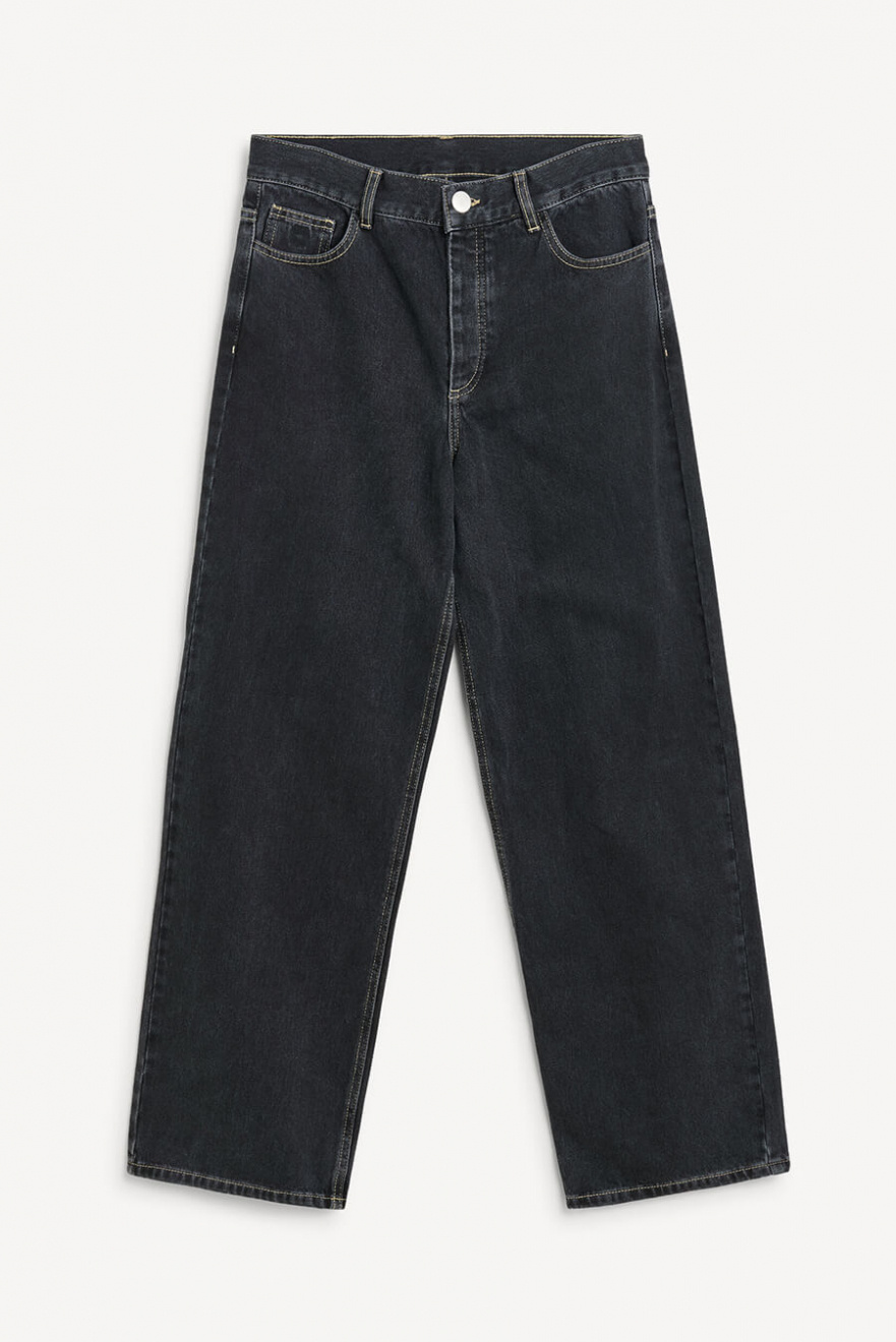 De svarta jeansen med lätt utsvängda ben och lös passform är den ultimata basen i garderoben. Kombinera med en oversized skjorta för en chic vardagslook eller dressa upp med klackar. Ett måste för dig som vill ha både stil och komfort!Jeans i ekologisk bomull med något vida ben, medelhög midja, stängs med knappar fram och lös passform från By Malene Birger.