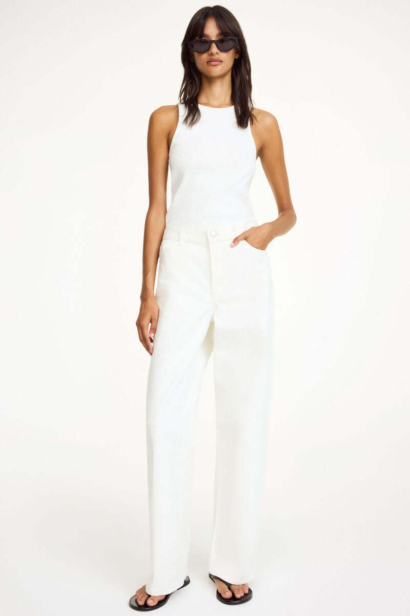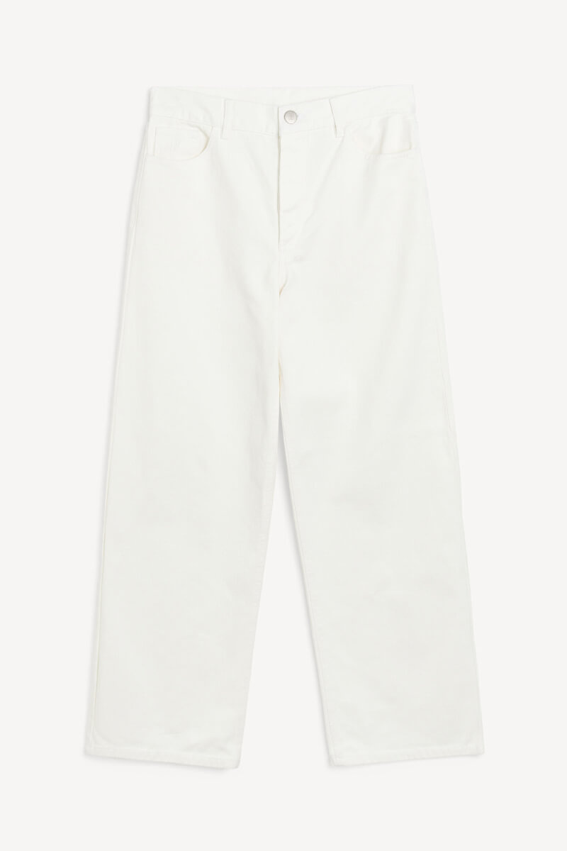 Vita jeans med avslappnad silhuett och diskret vidd nedtill – perfekta för en fräsch och modern stil. Bär dem med en stickad tröja för en ljus vårlook, eller addera smycken och sandaler för en sommarkväll. En tidlös favorit som passar till allt.Jeans i ekologisk bomull med något vida ben, medelhög midja, stängs med knappar fram och lös passform från By Malene Birger.