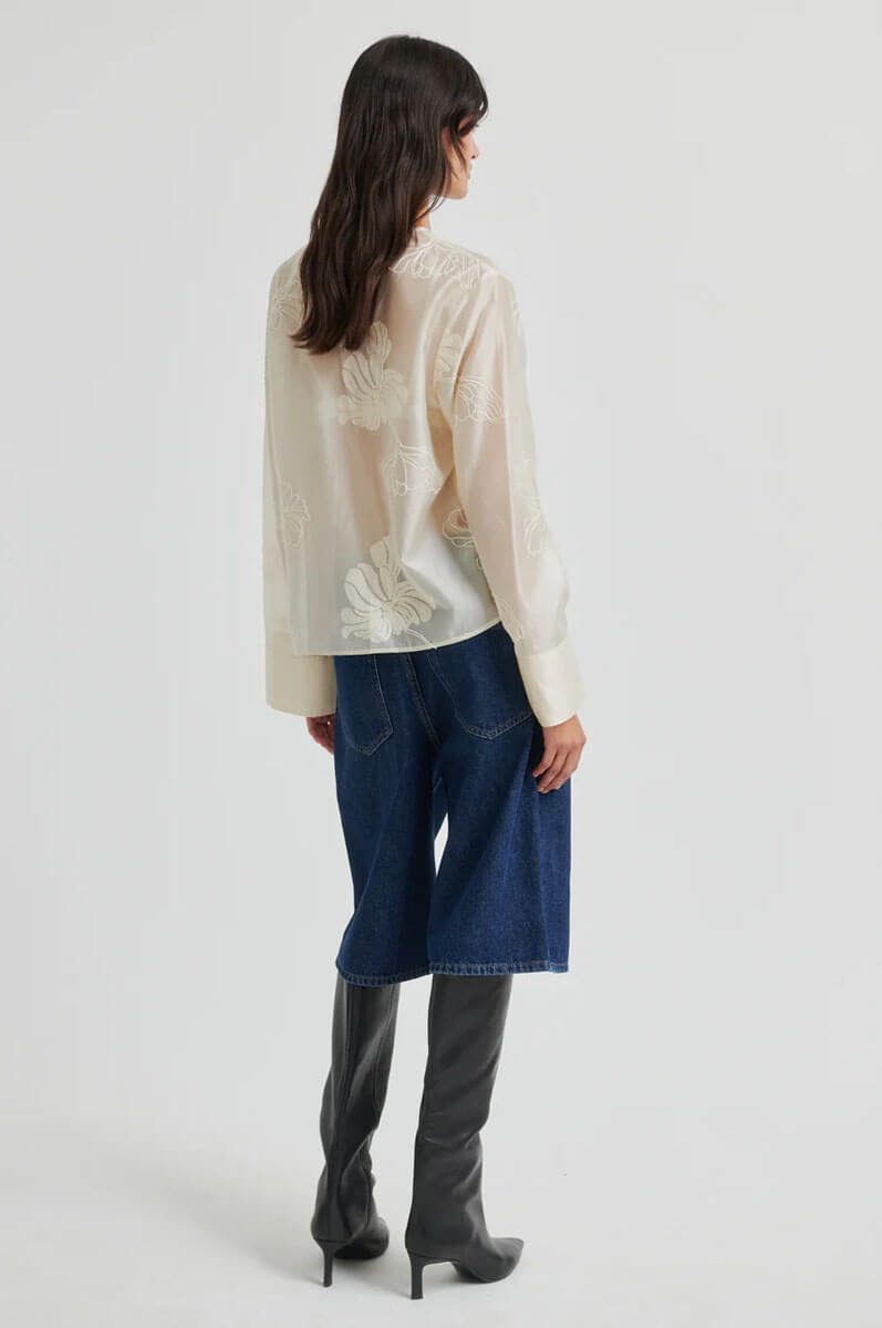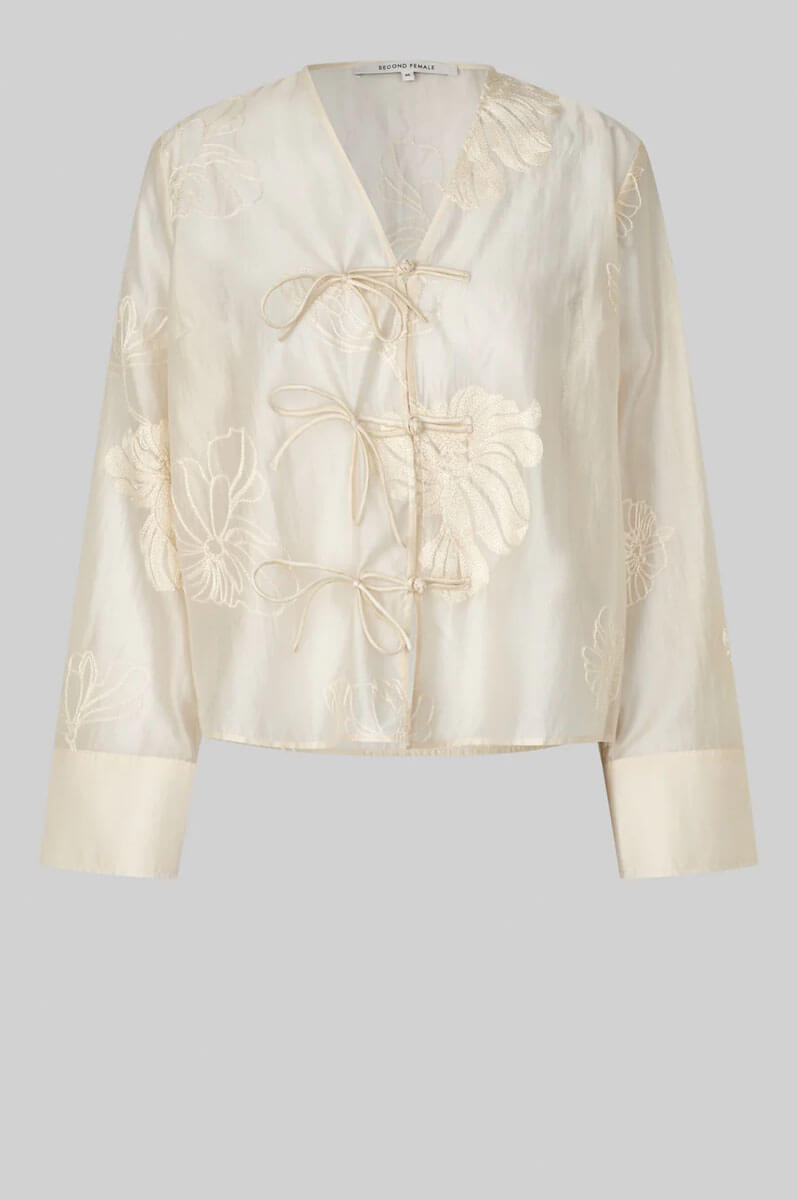 är tillverkad i ett semi-transparent tyg av 85 % lyocell och 15 % polyester, med ton-i-ton broderi som ger en subtil och elegant finish. Skjortan har V-ringning med klassiska knäppningar (frog closures), långa ärmar med breda manschetter och en avslappnad, vid passform.