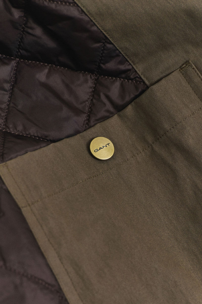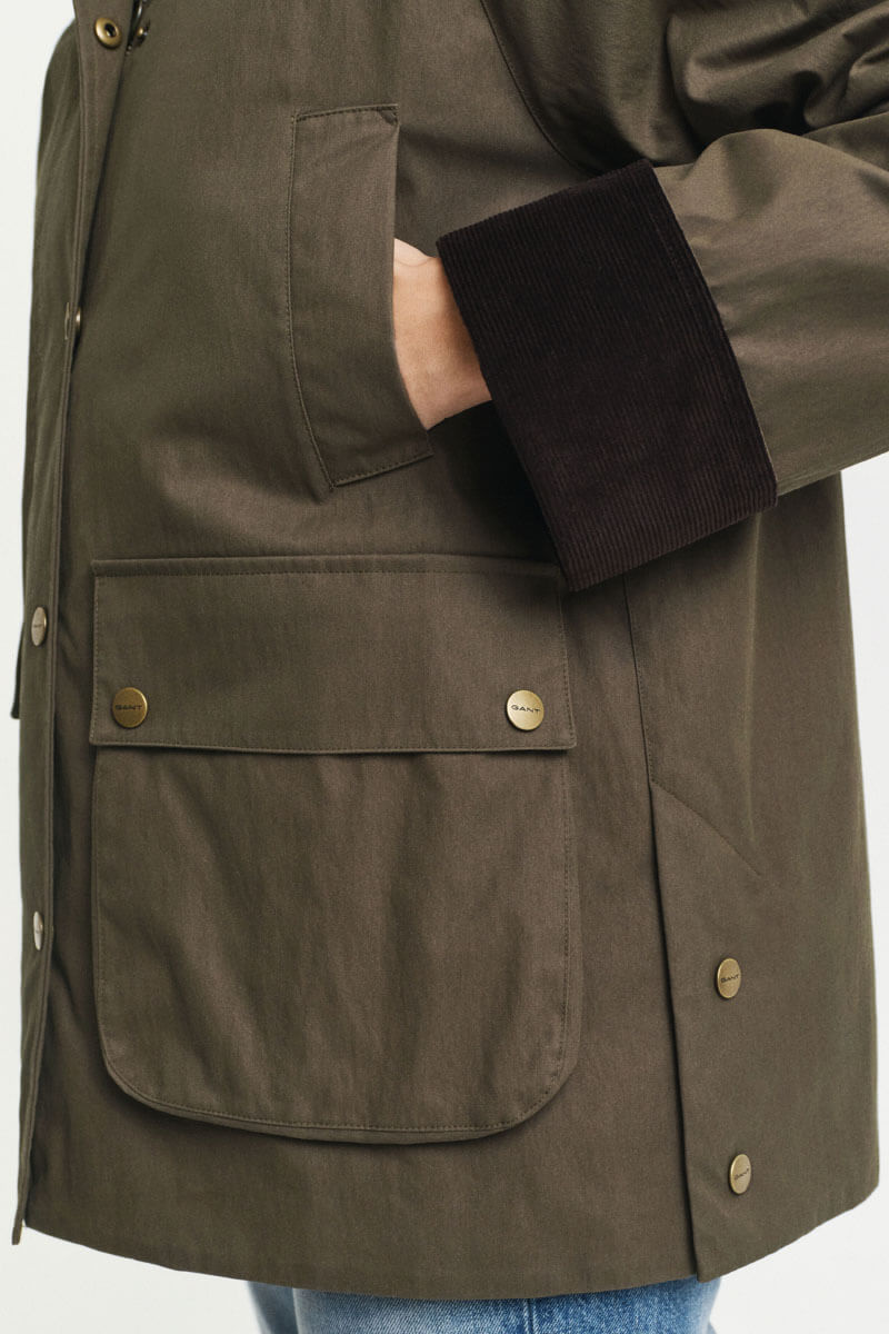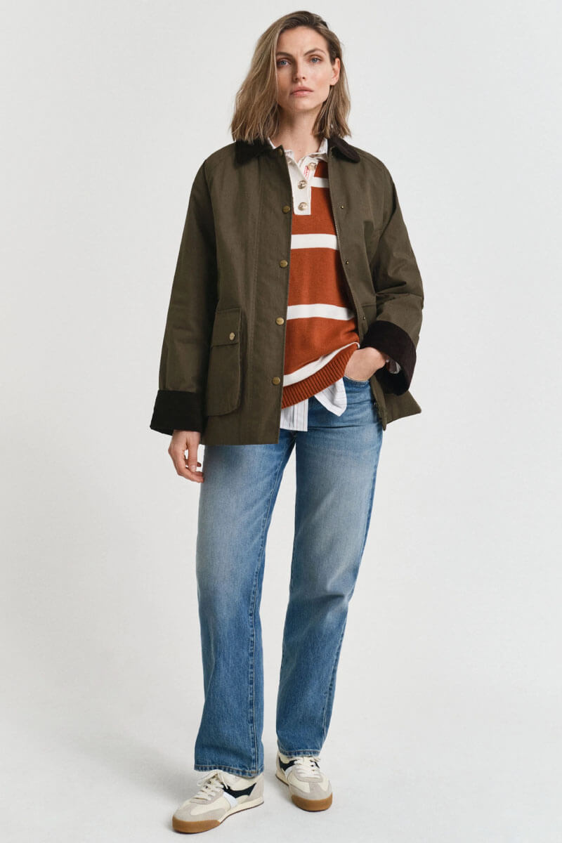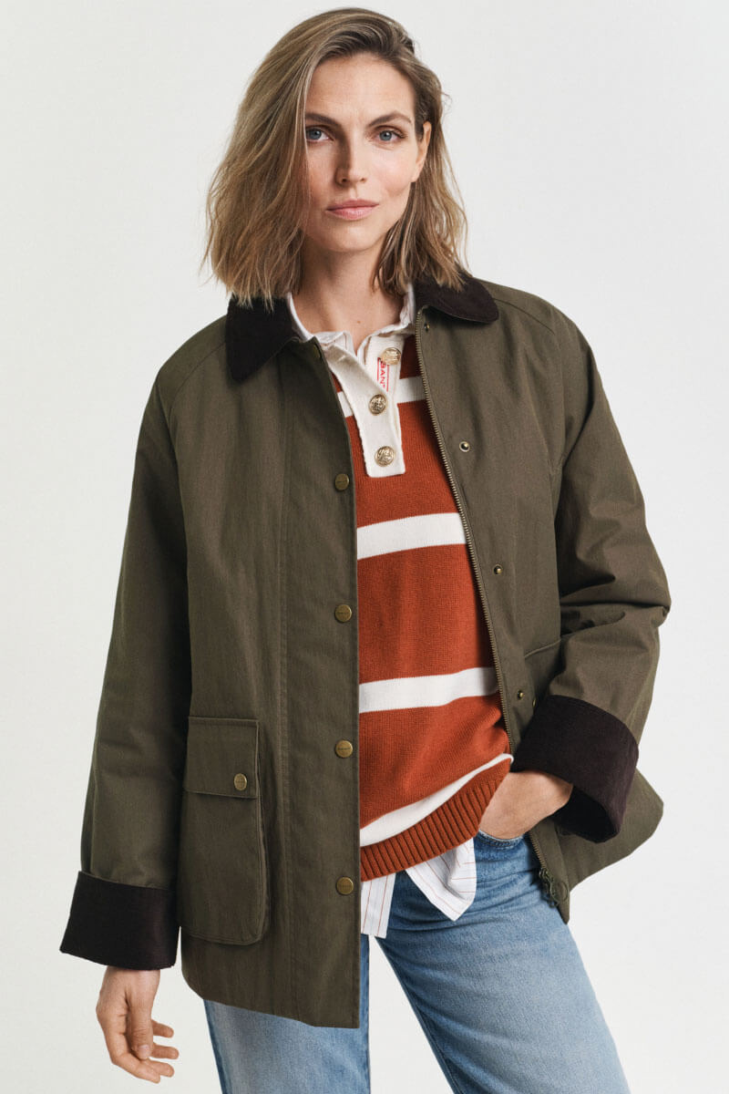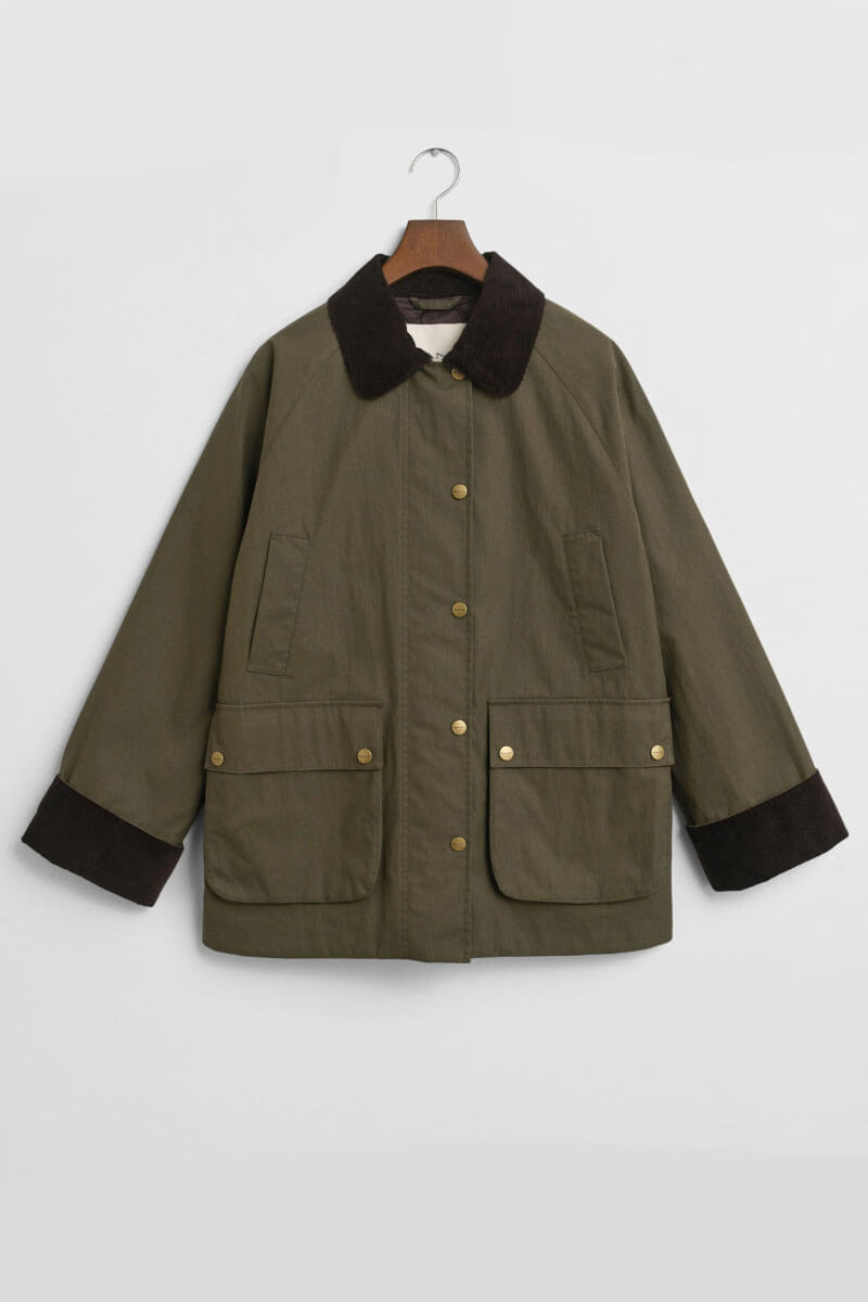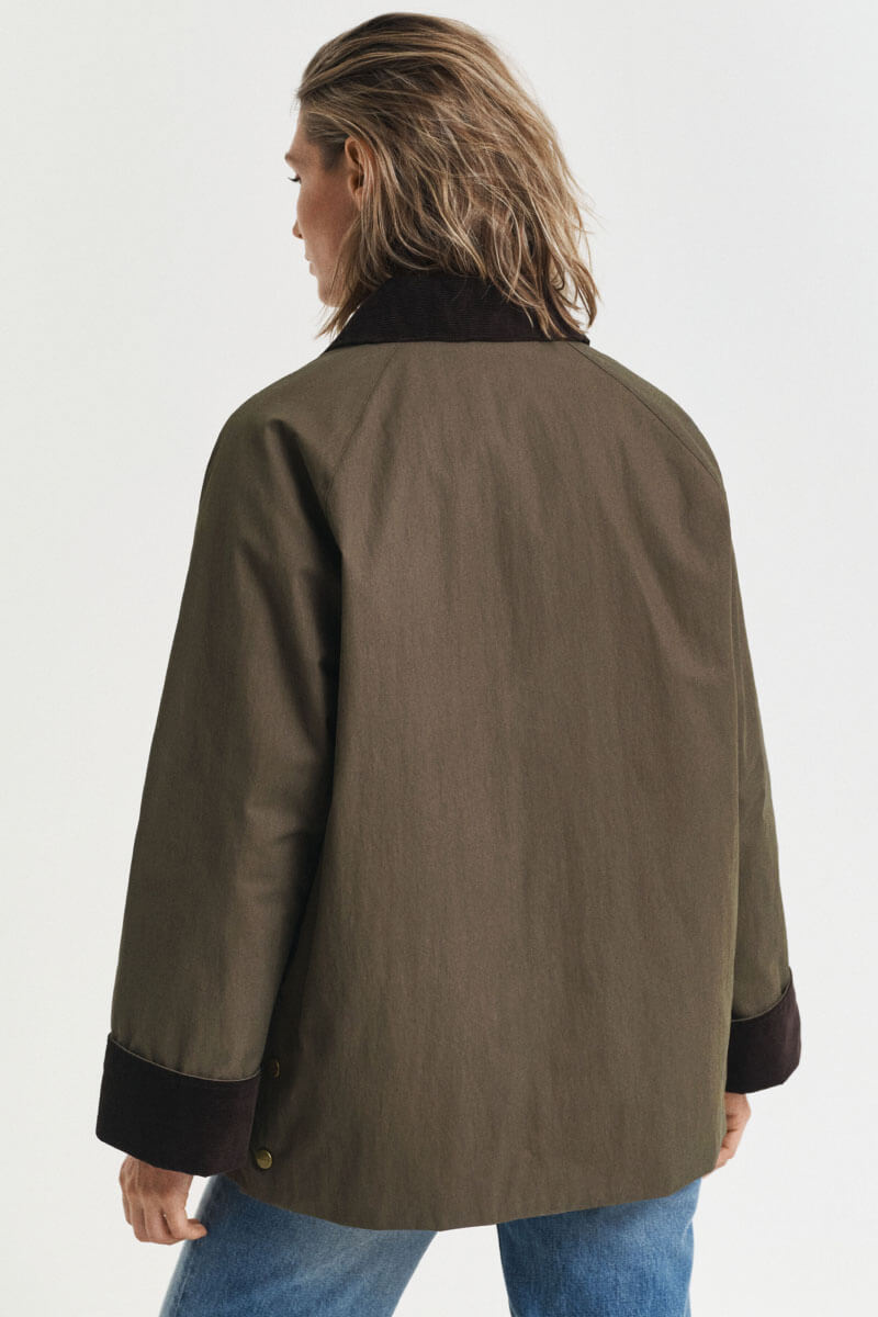 En vaxad jacka med modern lantkänsla – höftlång modell med vida raglanärmar, kontrasterande manchesterkrage och praktiska fickor. En tidlös ytterjacka att bära över stickat eller skjorta. Perfekt för säsongens skiftande väder.Jacka i en bomullsblandning med manchesterkrage, lös passform, fickor fram, en innerficka, vida ärmar, lätt vadderad, stängs med dragkedja och pressknappar fram från Gant.