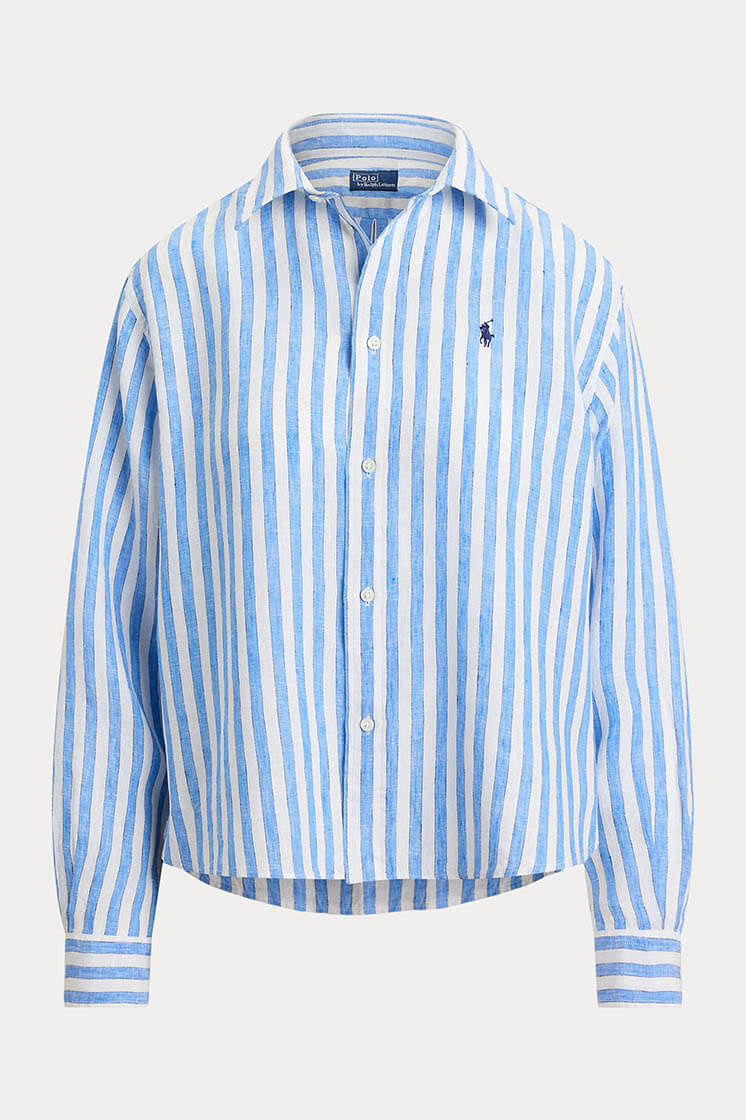 Tillverkad i sval och luftig linne är denna randiga skjorta från Polo Ralph Lauren designad i en vid, croppad silhuett som ger en avslappnat modern känsla. Nedhasade axlar och generös passform skapar ett elegant fall, medan det ikoniska broderade Pony-emblemet på bröstet sätter en signaturprägel. Bär den till högmidjade jeans, skräddade byxor eller över badkläder under varma dagar.