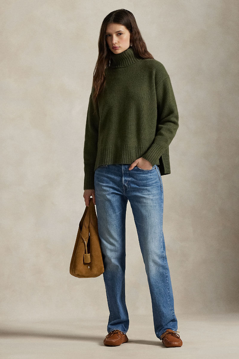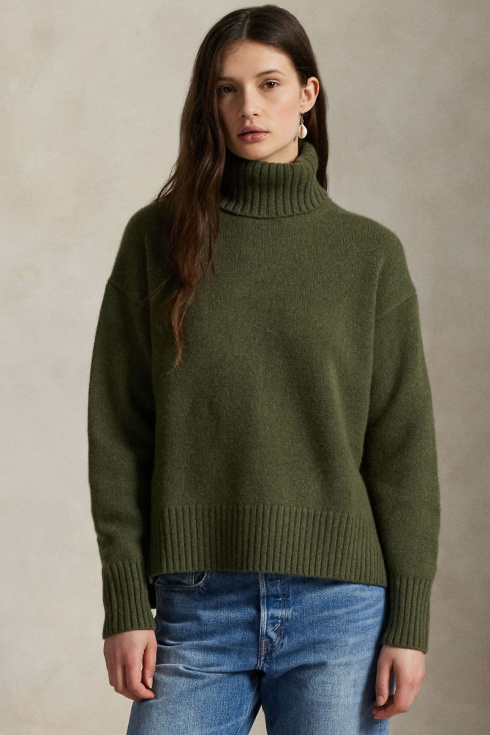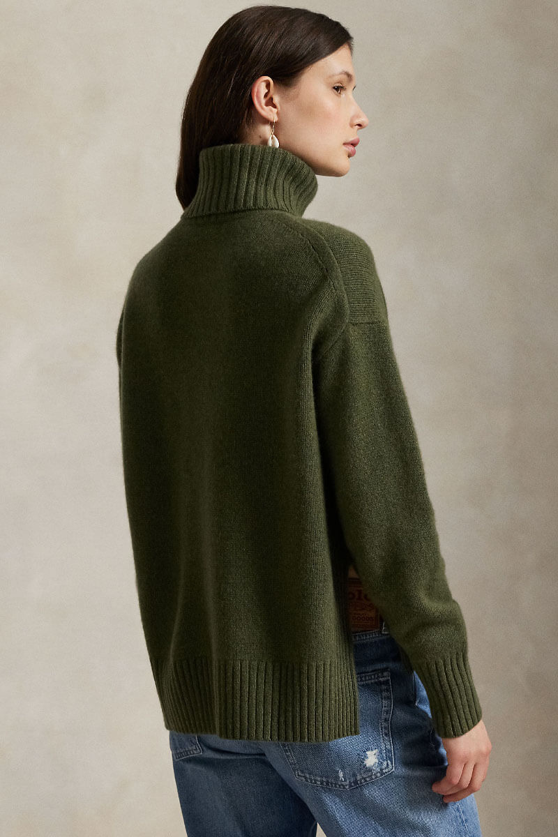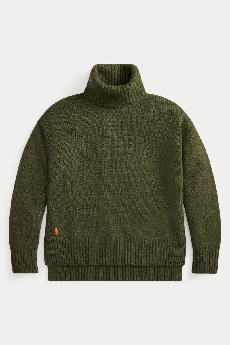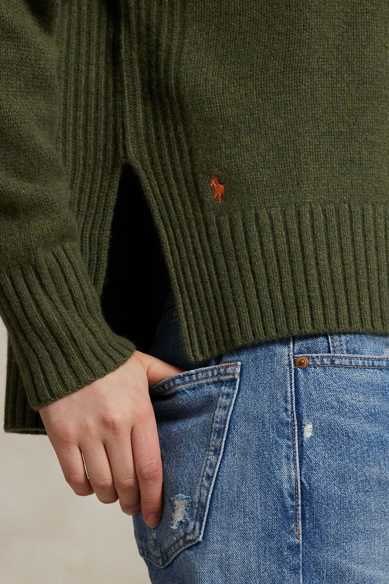 Olivgrön polotröja i ull – sofistikerad och avslappnad. Färgtonen flirtar med minimalism och ger struktur åt en annars enkel look. Mys möter stilmedveten skärpa.Stickad tröja i ull med lös passform, polokrage, ribbstickade kanter, liten broderad logga, slitsar i sidan och fallande axelsömmar från Polo Ralph Lauren.
