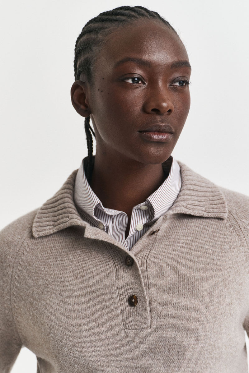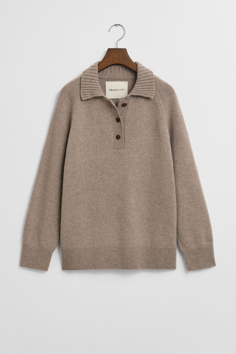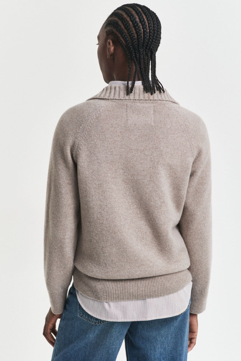 En mjuk kashmir- och ulltröja i taupe blir din stilsäkra vinterkompis. Bär över en sidenblus med vida byxor för kontoret eller till smala jeans och loafers för helgens eleganta men avslappnade look.Stickad tröja i en mjuk kashmirblandning med krage, knappar fram, ledig passform, raglanärmar och ribbstickade kanter från Gant.
