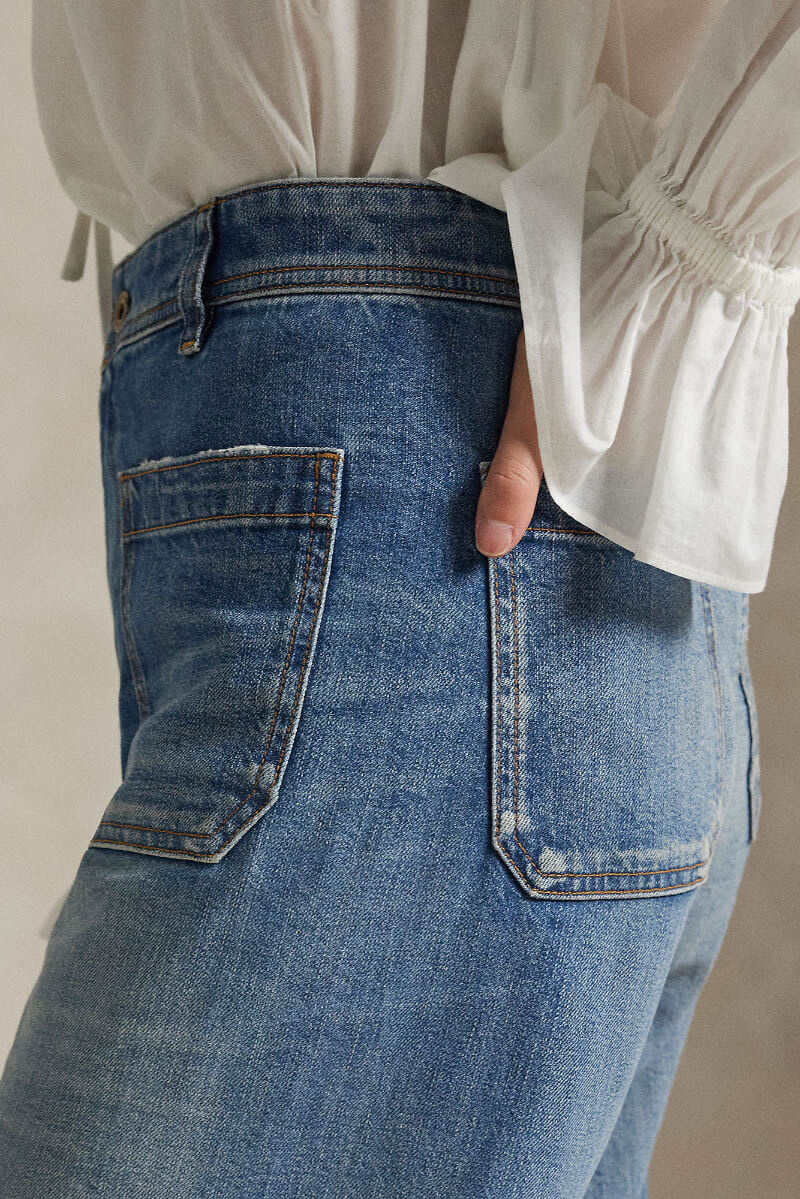 Ett par moderna och tidlösa jeans. Dessa jeans är tillverkade i mediumtung denim med stretch och har fickor framtill. Den mellanblå tvätten med handgjorda slitningar vilket ger ett autentiskt, lätt slitet uttryck som känns både modernt och avslappnat. Bär det med en instoppad blus eller t-shirt.