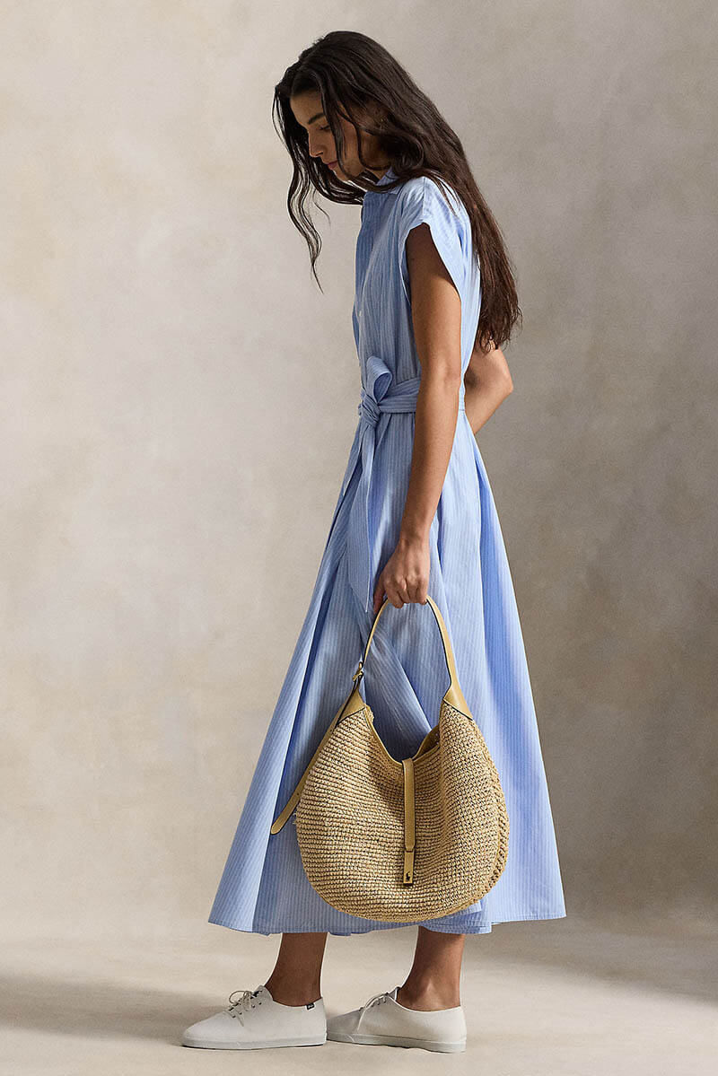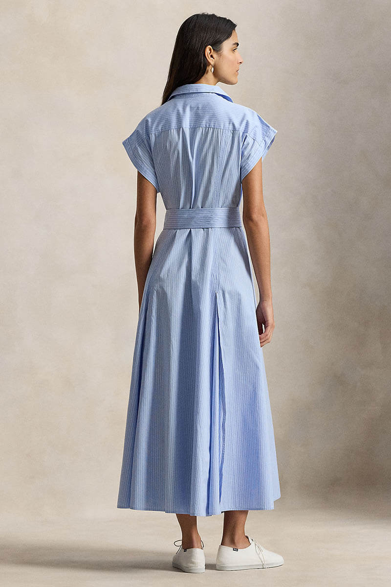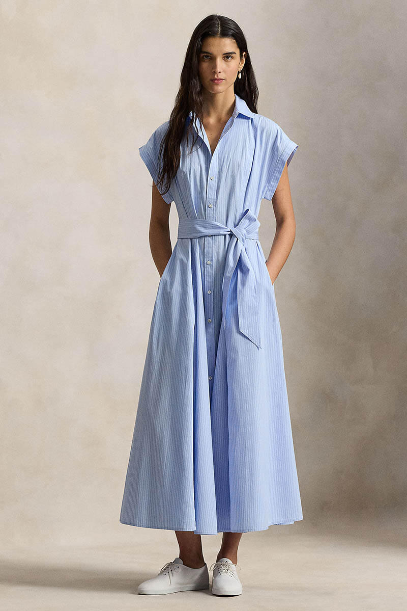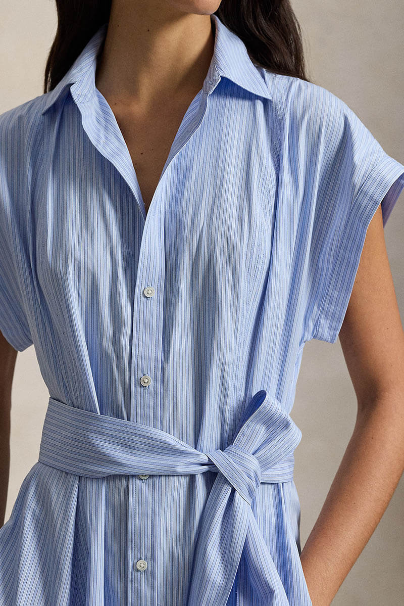 Denna eleganta skjortklänning i mjuk, garnfärgad bomull kombinerar klassisk skräddarkänsla med modern design. Kortärmad överdel med spetskrage och knappslå möter en utsvängd A-linjeformad kjol med subtila inverterade boxveck som ger rörelse och lätthet. Ett midjeband i samma tyg markerar midjan och skapar en smickrande siluett.