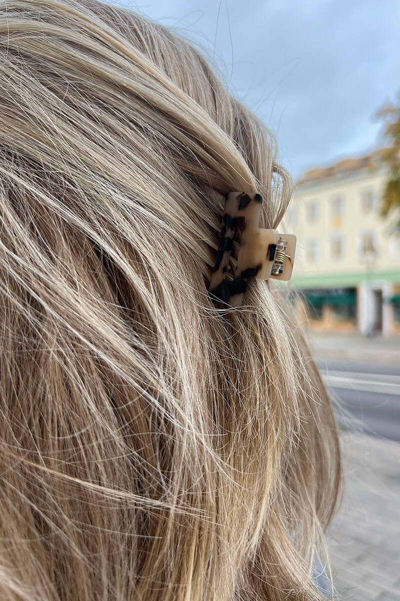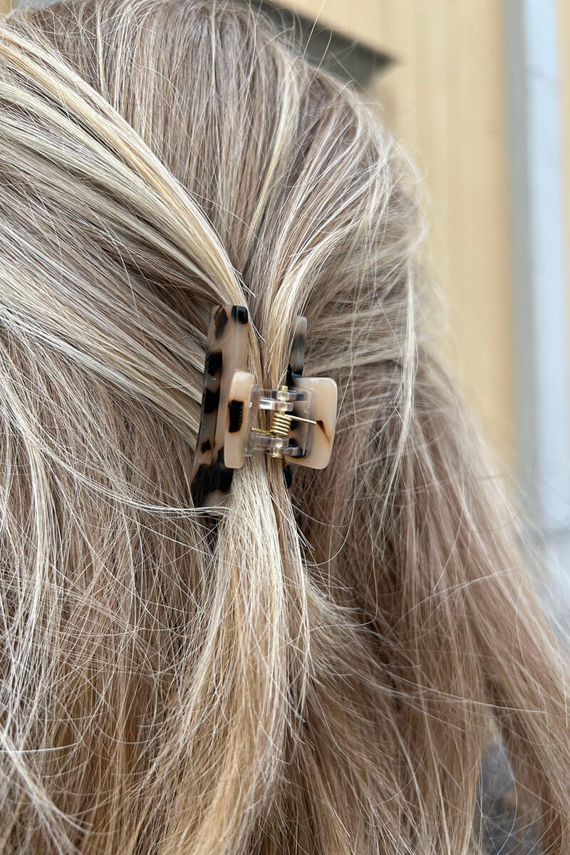Elegant och tidlös hårklämma i glansigt cellulosaacetat. Den perfekta detaljen för att hålla upp små hårpartier eller skapa en diskret, sofistikerad look. Den höga kvaliteten i materialet ger både hållbarhet och en vacker glans.