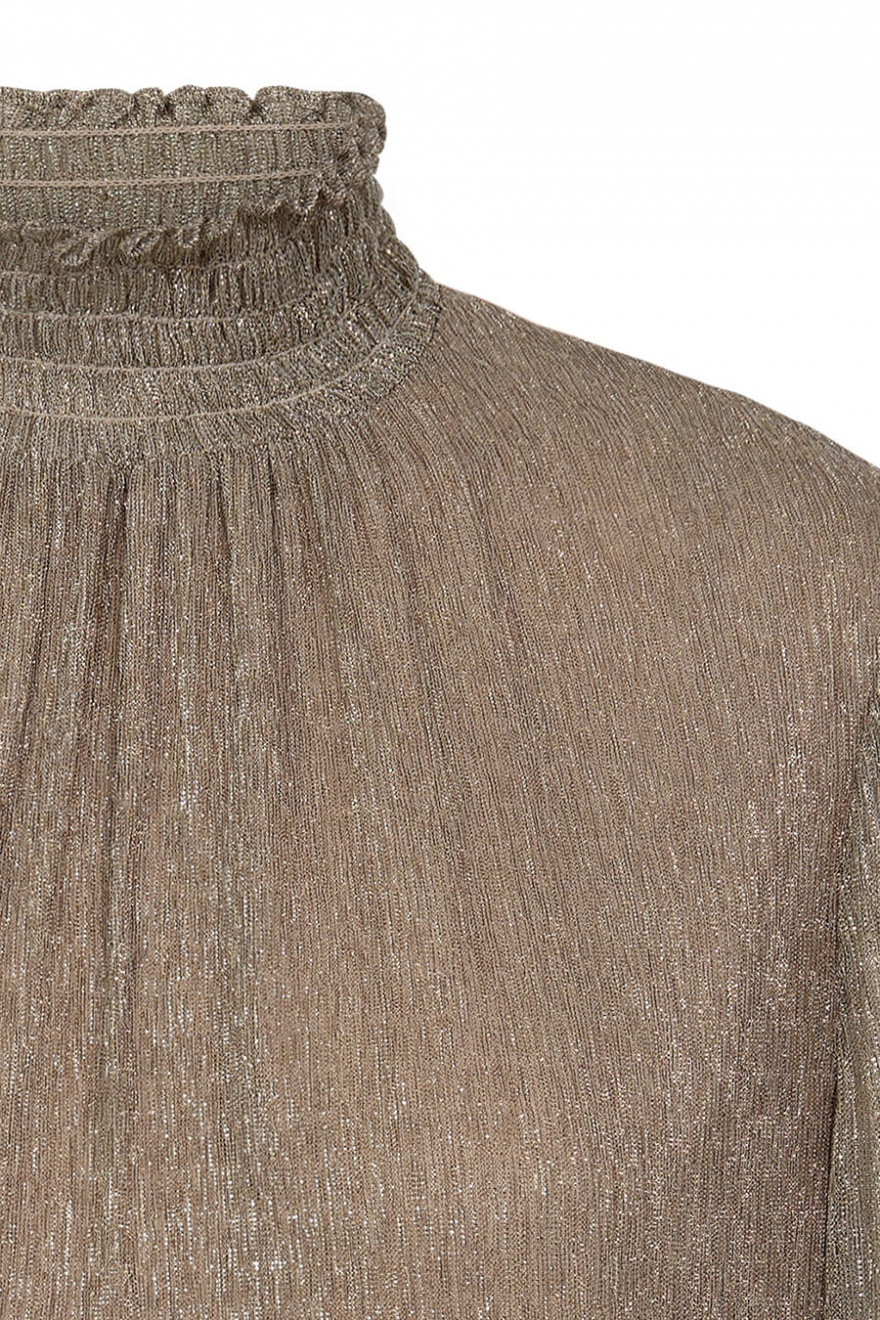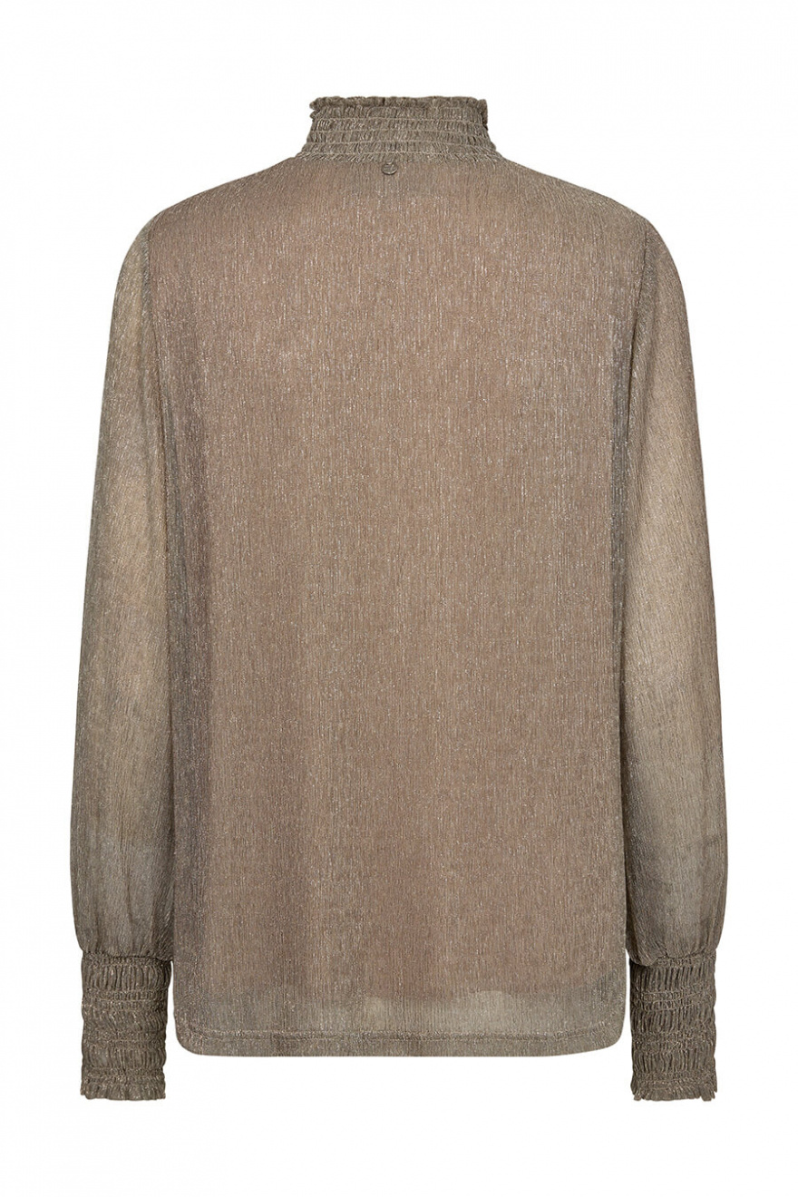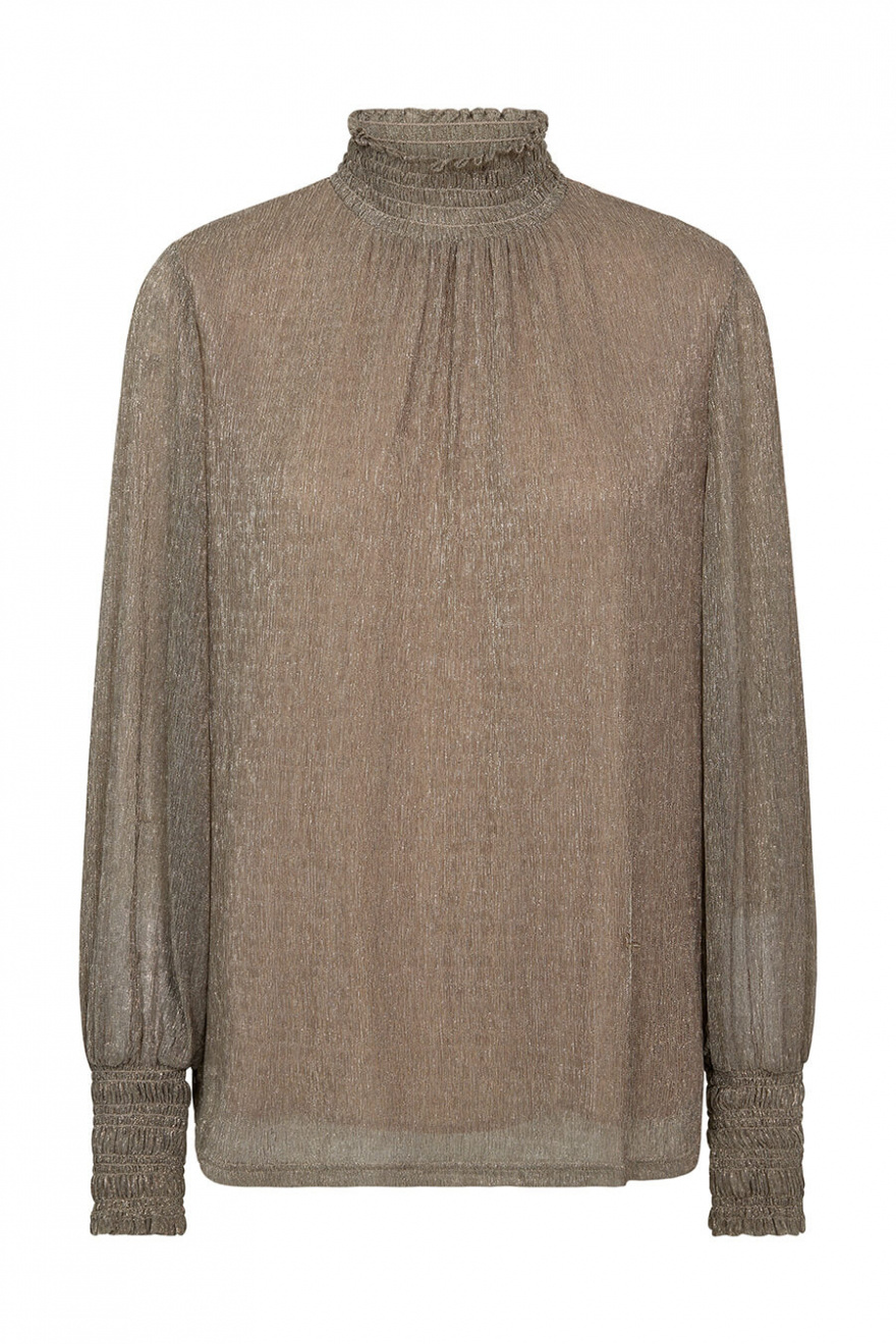 Denna långärmade blus i skimrande guld är ren elegans! Perfekt för både på dagen och kvällen. Lätt att styla, den adderar omedelbart stil till varje outfit!Långärmad blus med lös passform, hög halsringning, smock vid halsringning och ärmslut från MosMosh.