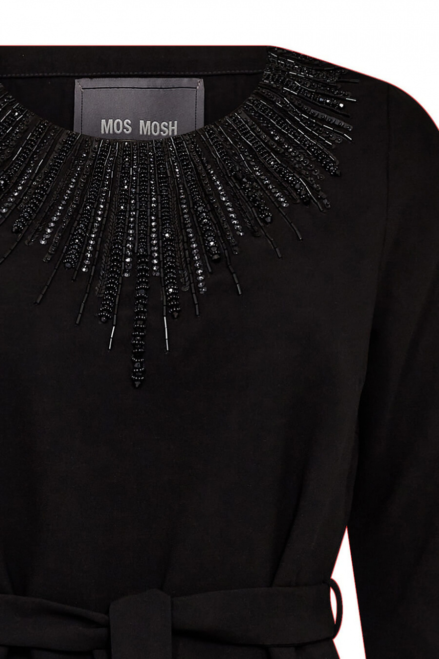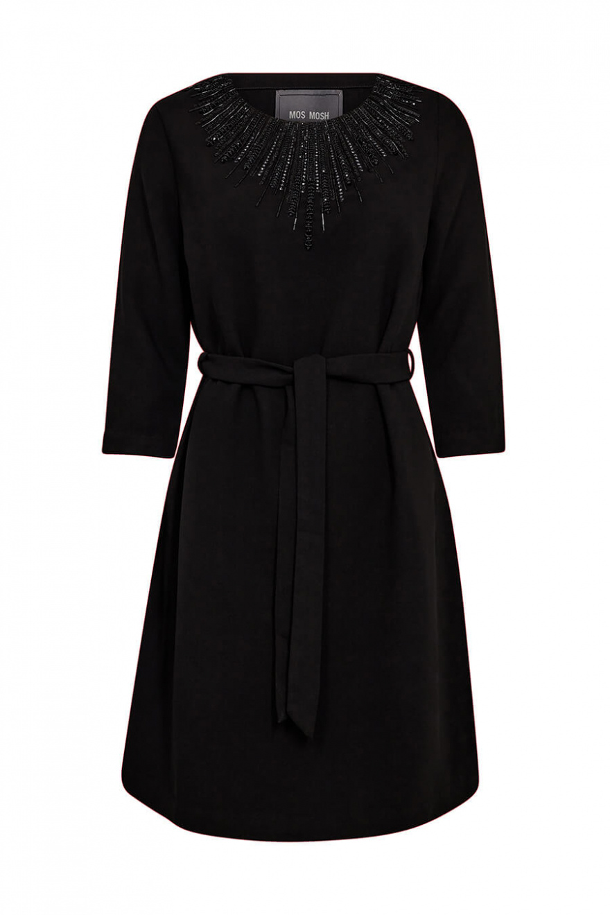 Pärldetaljerna ger en sofistikerad glans medan bältet framhäver midjan och skapar en elegant silhuett. Perfekt för både festliga tillfällen och stilsäkra vardagar.Klänning i en ledig passform med matchande bälte i midjan, rund halsringning och deorativa pärlor fram från MosMosh.
